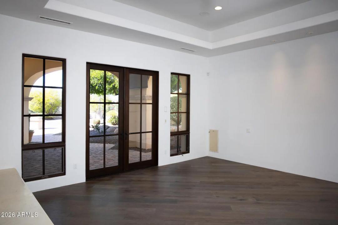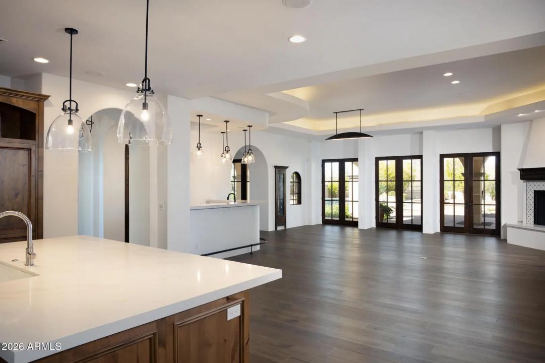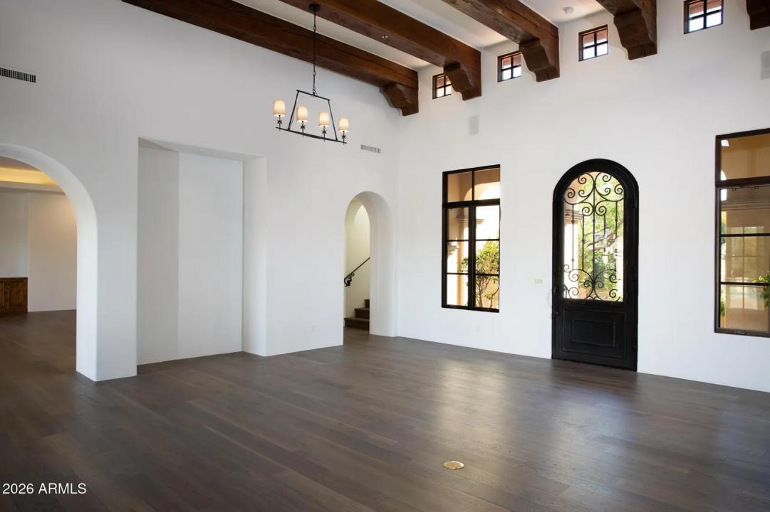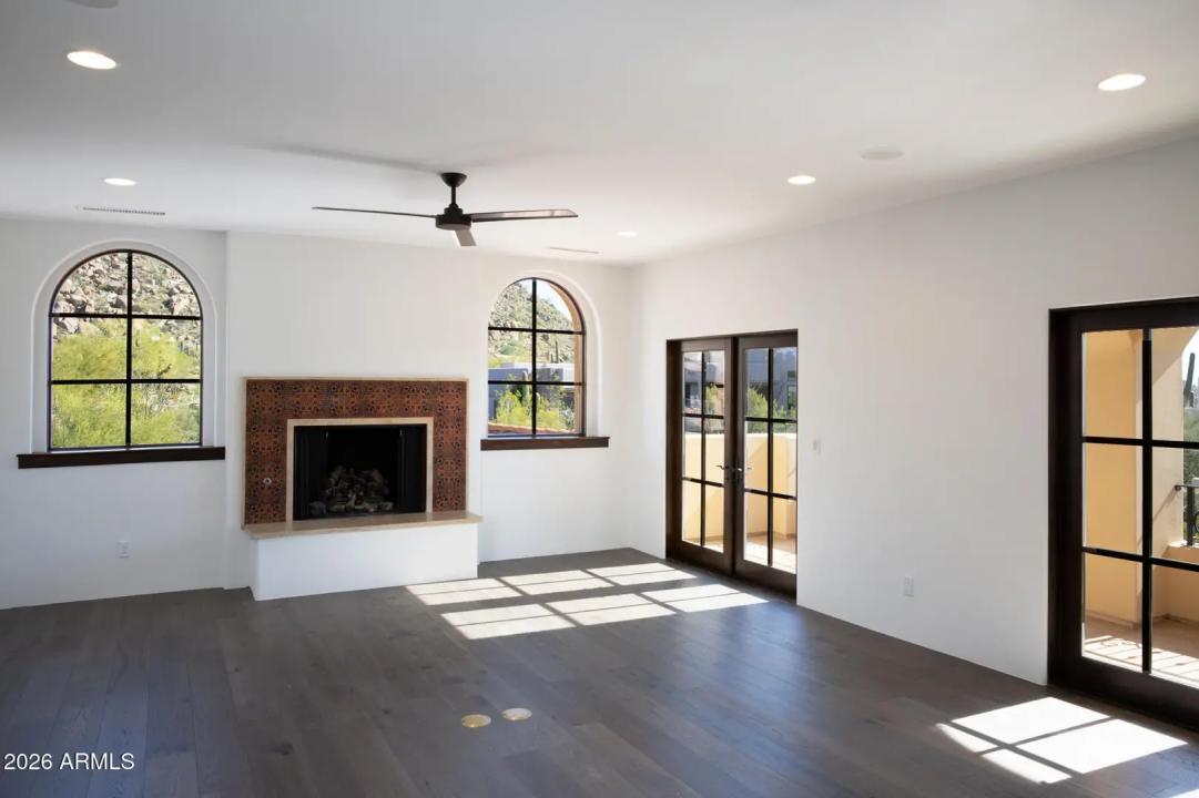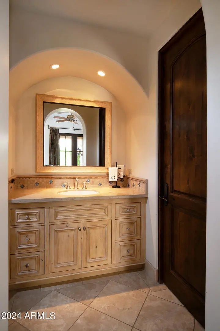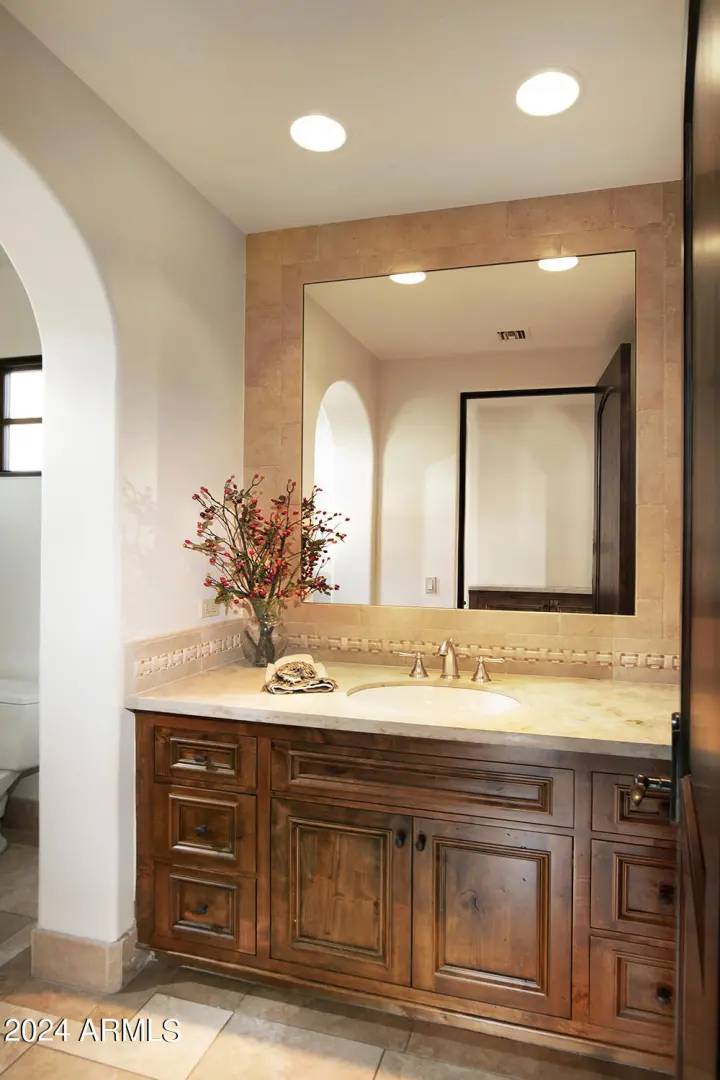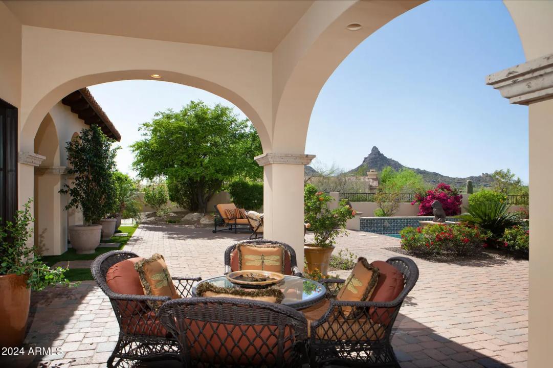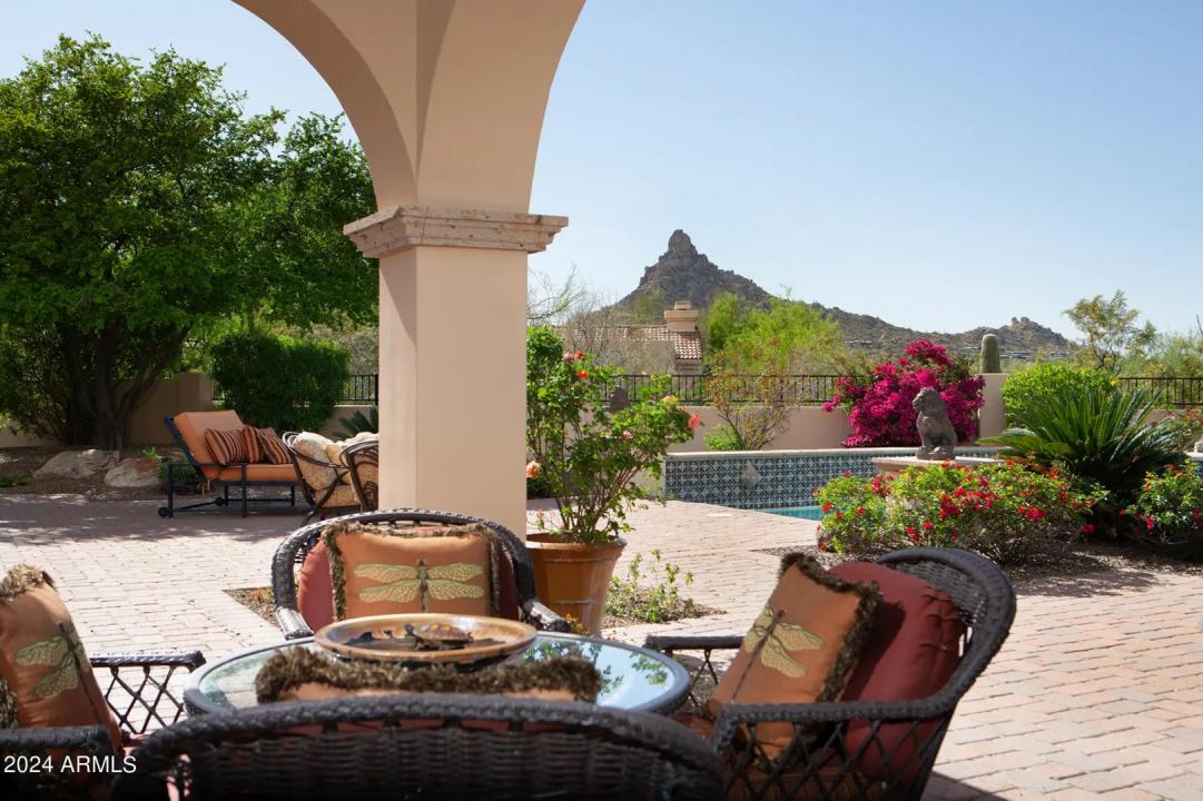 This timeless styled Spanish Colonial home rests in guard gated Windy Walk Estates has just been updated and has stunning views of Pinnacle Peak, Troon Mountain and city lights. The luxurious home is all on one level except for a large 875/sf 2nd level game/bedroom with its own fireplace, full bath and balcony overlooking city light views. You enter the main home through a hand forged iron gate into a charming front courtyard with bubbly fountain. The iron front door opens to the formal living and dining areas with rough sawn beams and stone fireplace. 3 bedrooms on the main level plus an office. The large family room opens to the kitchen and includes a corner fireplace, walk-up wet bar with ice maker, dishwasher, Sub-Zero wine and beverage drawers, and plenty seating area plus room for...