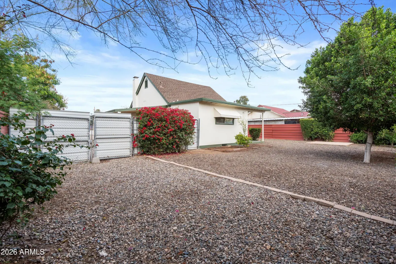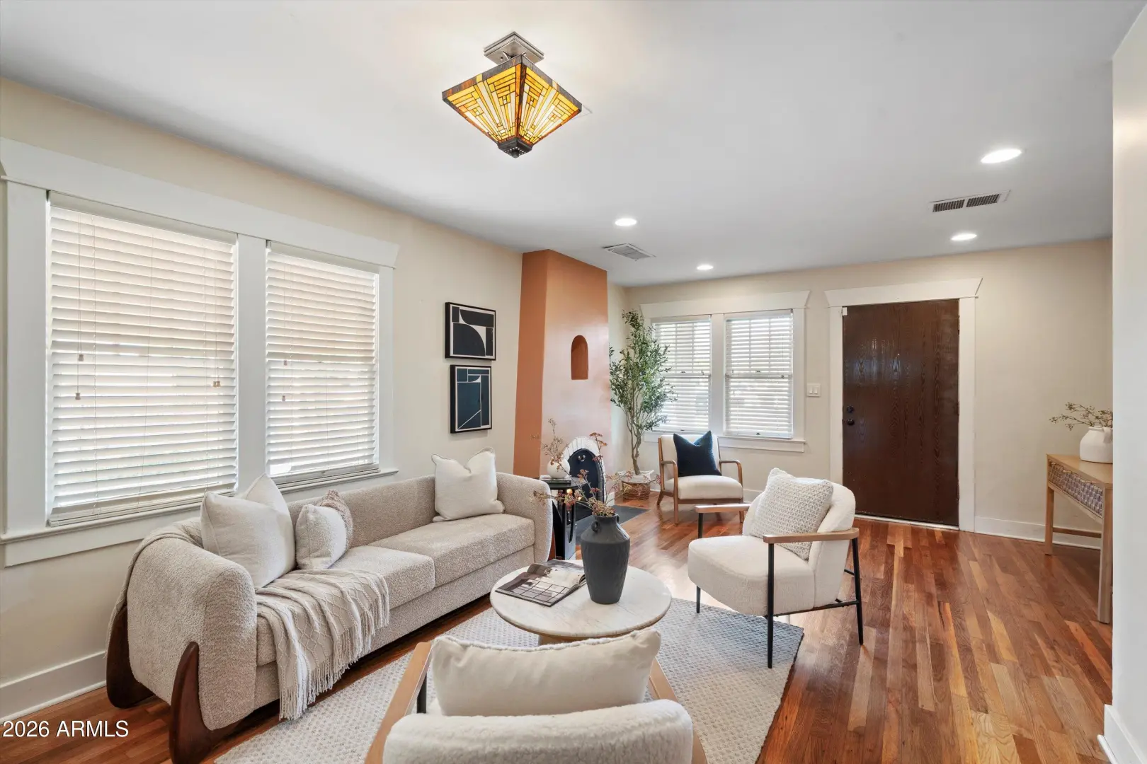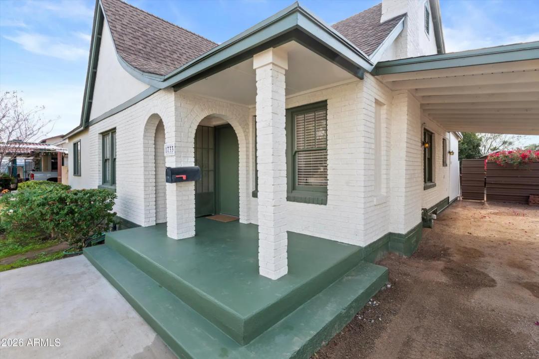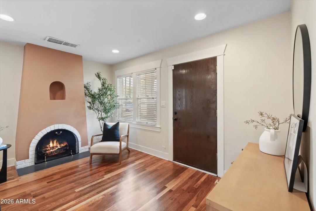 If you've been waiting for a truly special 1920s Tudor in Central Phoenix, this home delivers. Inside, refinished wood floors set the tone, and the living room is warm and inviting with a wood-burning fireplace and abundant natural light throughout. The eat-in kitchen is modern and functional, featuring a large island that works well for everyday living and casual gatherings. The primary bedroom includes an attached office space, ideal for working from home or creating a quiet retreat that still feels connected to the rest of the home. The second bedroom is light and bright, and the bathroom maintains its original character with charming penny tile. Outside, the oversized lot is zoned R3 and offers endless potential, complete with a carport and ample outdoor space. Major improvements