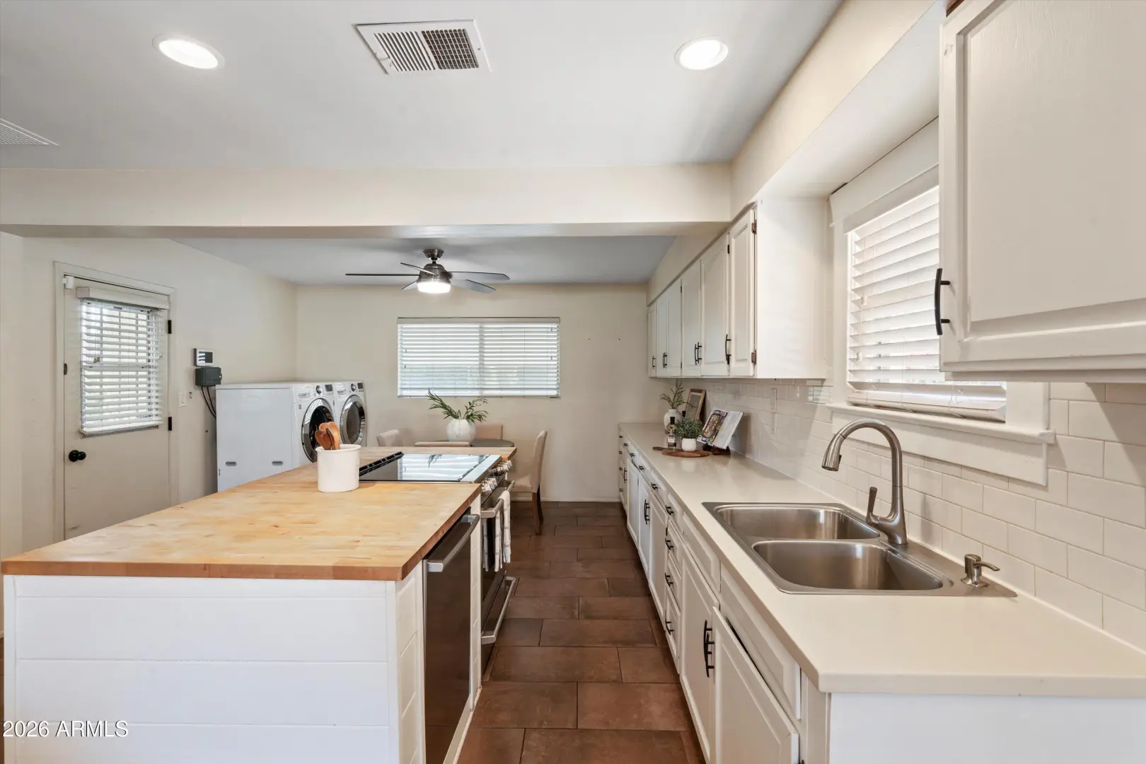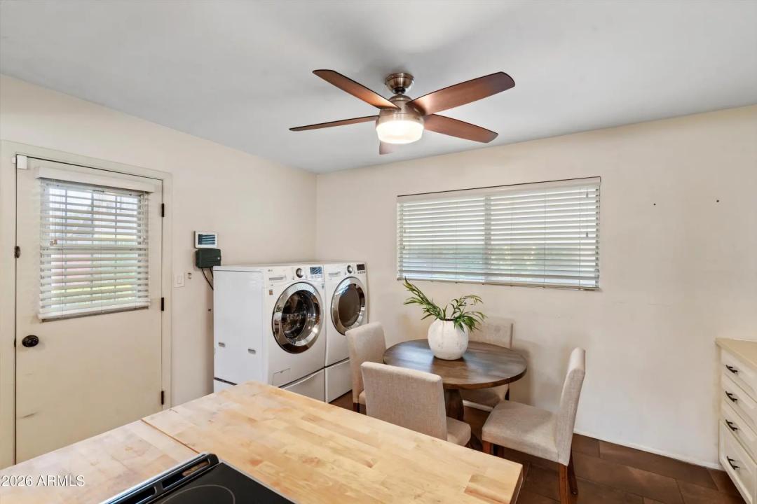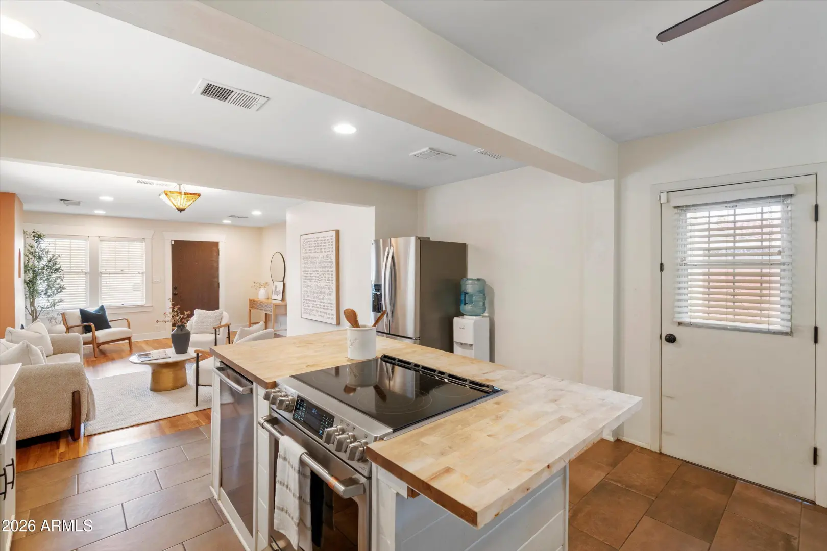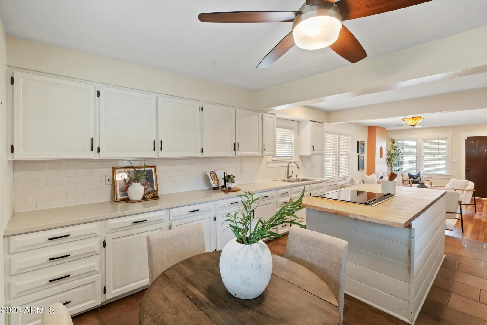 If you've been waiting for a truly special 1920s Tudor in Central Phoenix, this home delivers. Inside, refinished wood floors set the tone, and the living room is warm and inviting with a wood-burning fireplace and abundant natural light throughout. The eat-in kitchen is modern and functional, featuring a large island that works well for everyday living and casual gatherings. The primary bedroom includes an attached office space, ideal for working from home or creating a quiet retreat that still feels connected to the rest of the home. The second bedroom is light and bright, and the bathroom maintains its original character with charming penny tile. Outside, the oversized lot is zoned R3 and offers endless potential, complete with a carport and ample outdoor space. Major improvements
