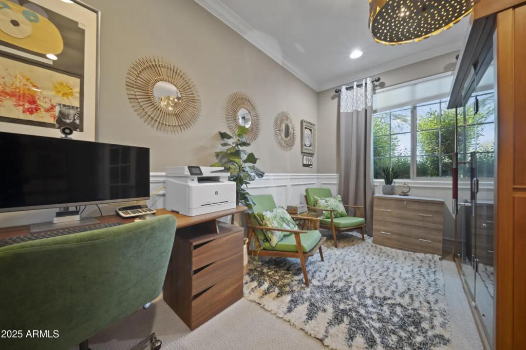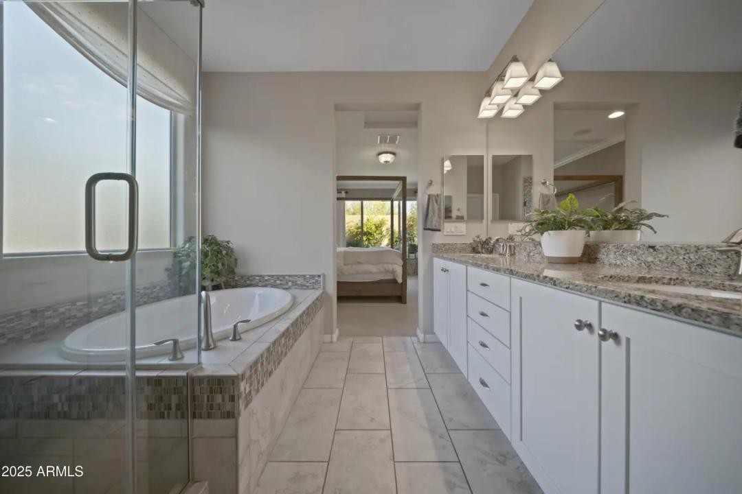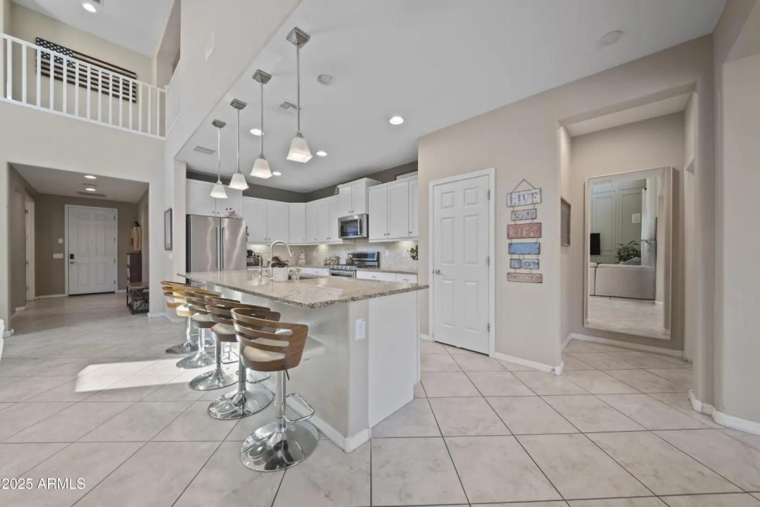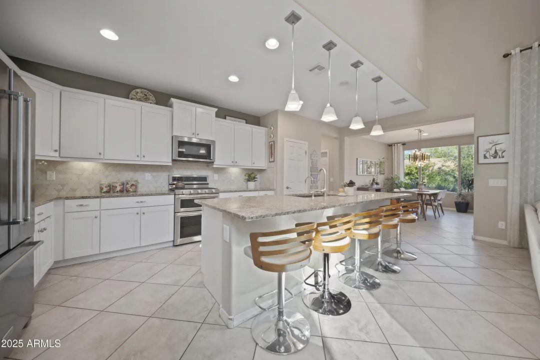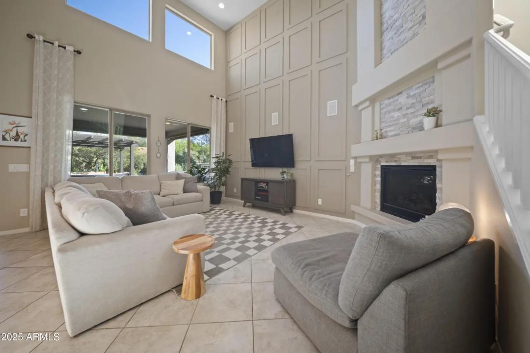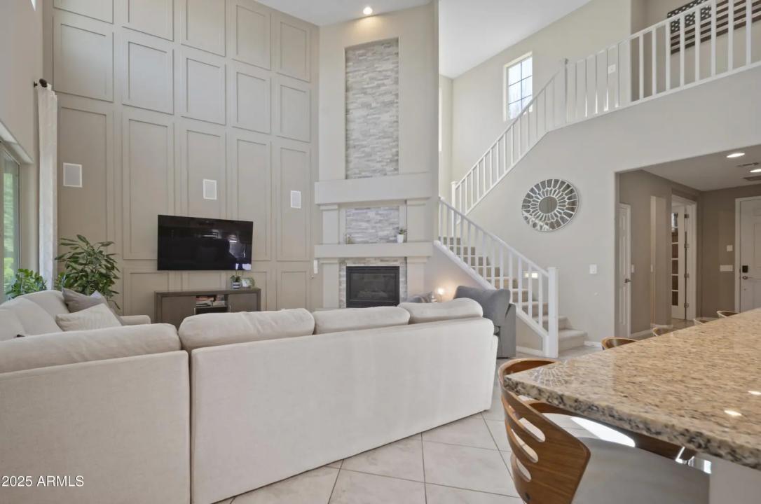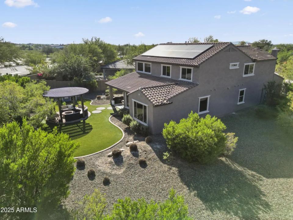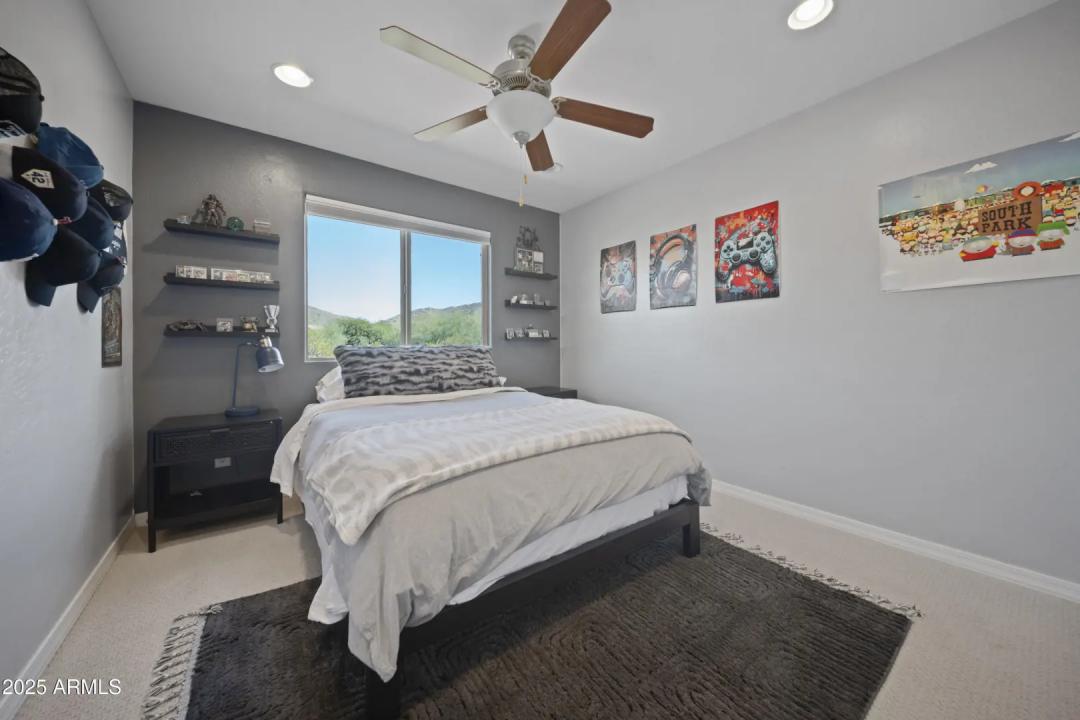 Discover this upgraded 5-bedroom, 4.5-bath home with a den and 2-car garage, perfectly situated in the Fireside at Norterra gated community. A primary suite upstairs and another primary suite downstairs offer ideal flexibility for guests or multi-generational living. The open, light-filled former model home is designed for comfort and entertaining, featuring a fireplace with stone detail, a modern kitchen, and a landscaped backyard. Owned solar keeps costs down. Fireside at Norterra residents enjoy world-class amenities including a 16,000 sq ft community center, 2 pools, fitness center, sauna, tennis & basketball. Nestled between the Sonoran Preserve and Norterra, you'll have access to 14+ miles of hiking trails as well as shopping, dining, and entertainment close by. Don't miss this gem.