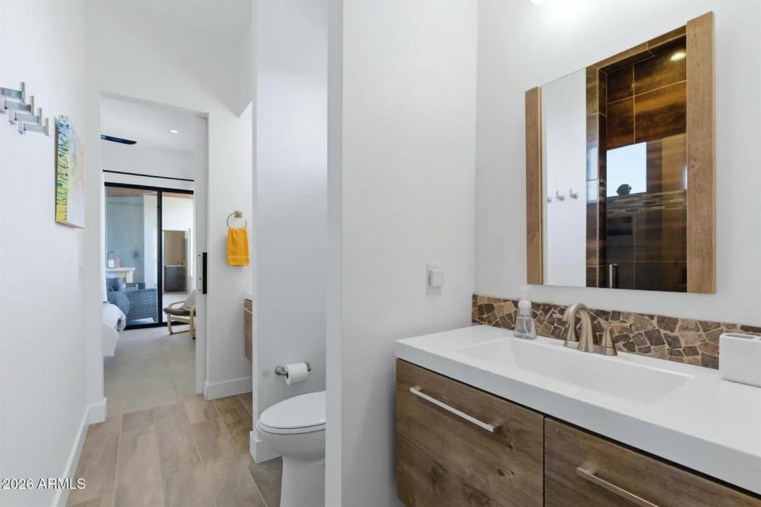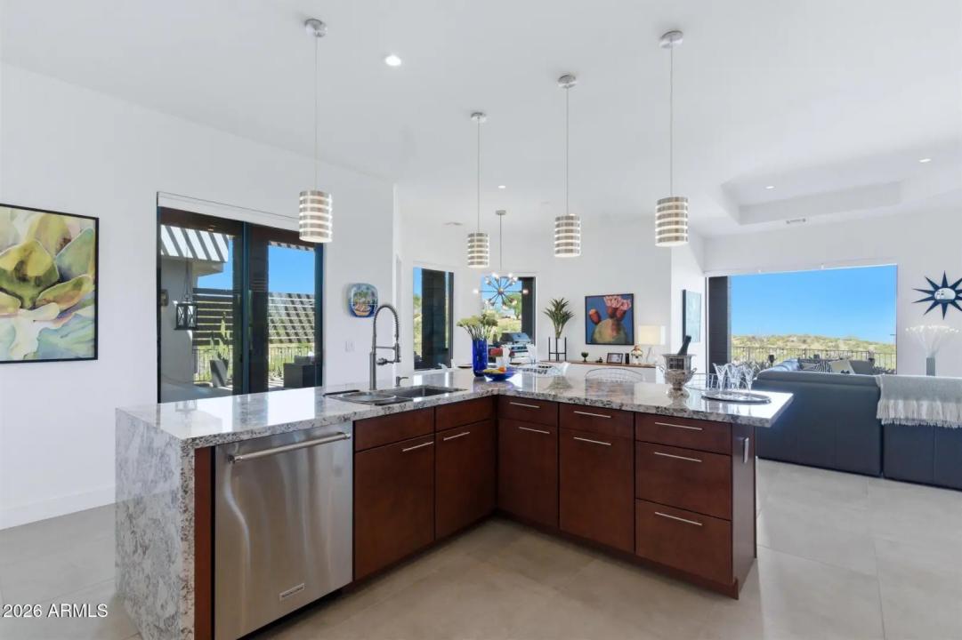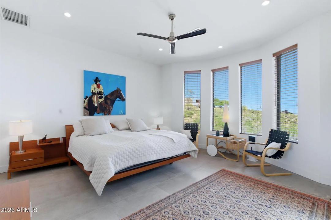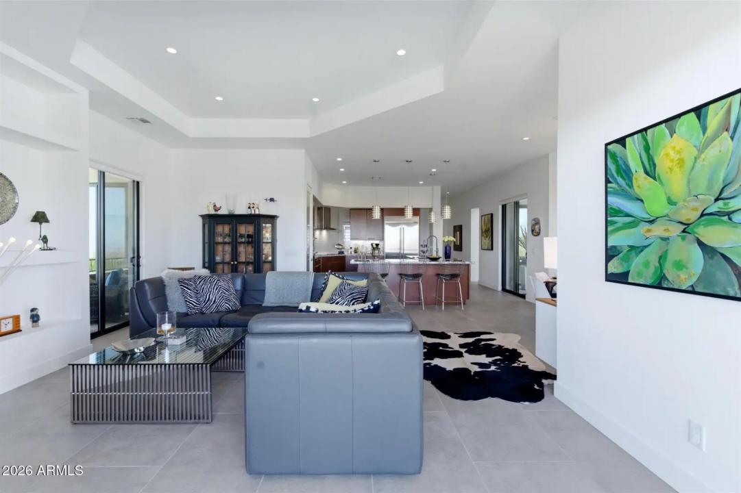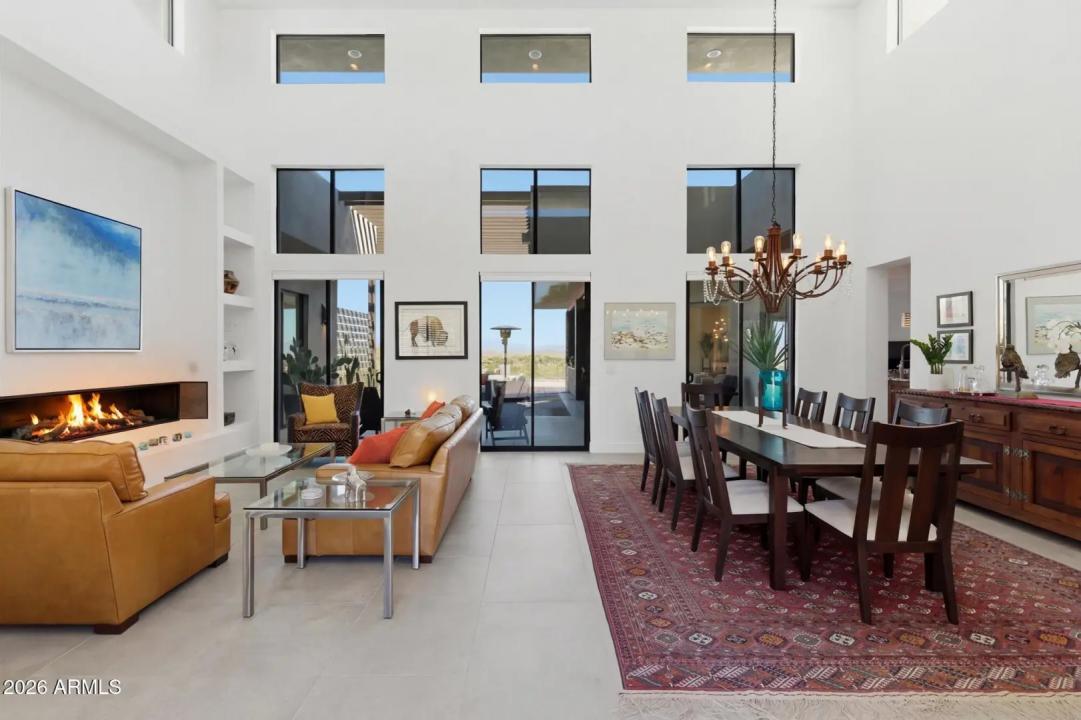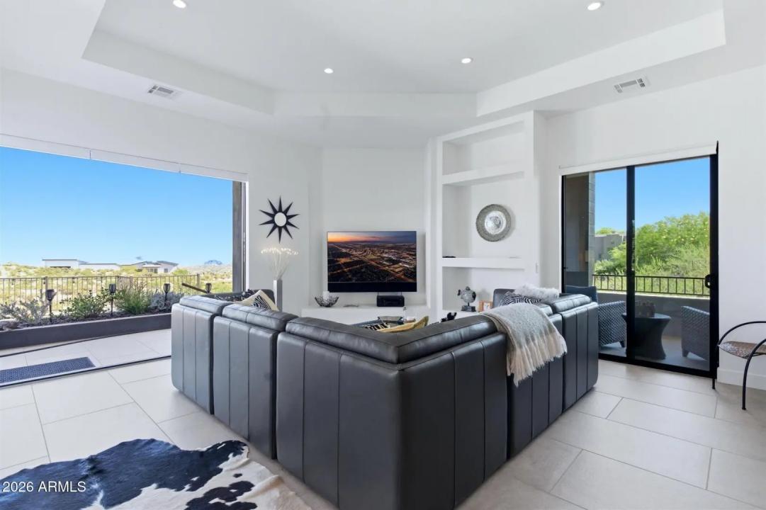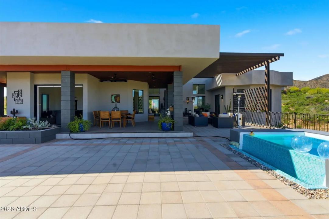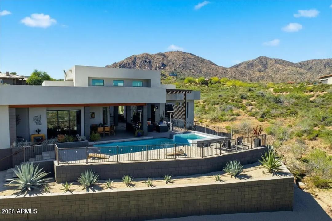 WELCOME HOME! ~Modern Scandinavian Luxury in Tonto Hills~ Experience elevated desert living in this exceptional modern Scandinavian-style residence, ideally positioned on a private 1.75-acre hillside lot at 3,455 ft in Tonto Hills. Surrounded by panoramic 360° views of Four Peaks, Weaver's Needle, and the Tonto National Forest, this custom home blends timeless Nordic design with Arizona's natural beauty. Designed for both serenity and entertaining, it offers over 2,400 sq. ft. of indoor-outdoor living including expansive patios, a spa, and elegant alfresco dining areas. The open-concept living space features soaring 20-ft ceilings, a sleek LED fireplace, and a chef's kitchen with waterfall granite countertops and premium KitchenAid appliances.