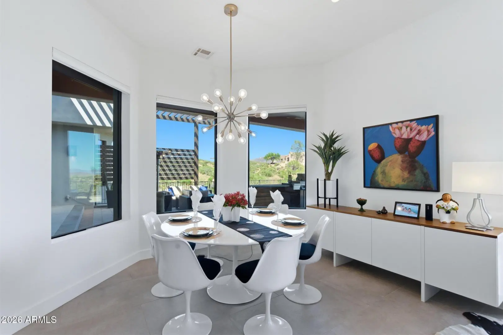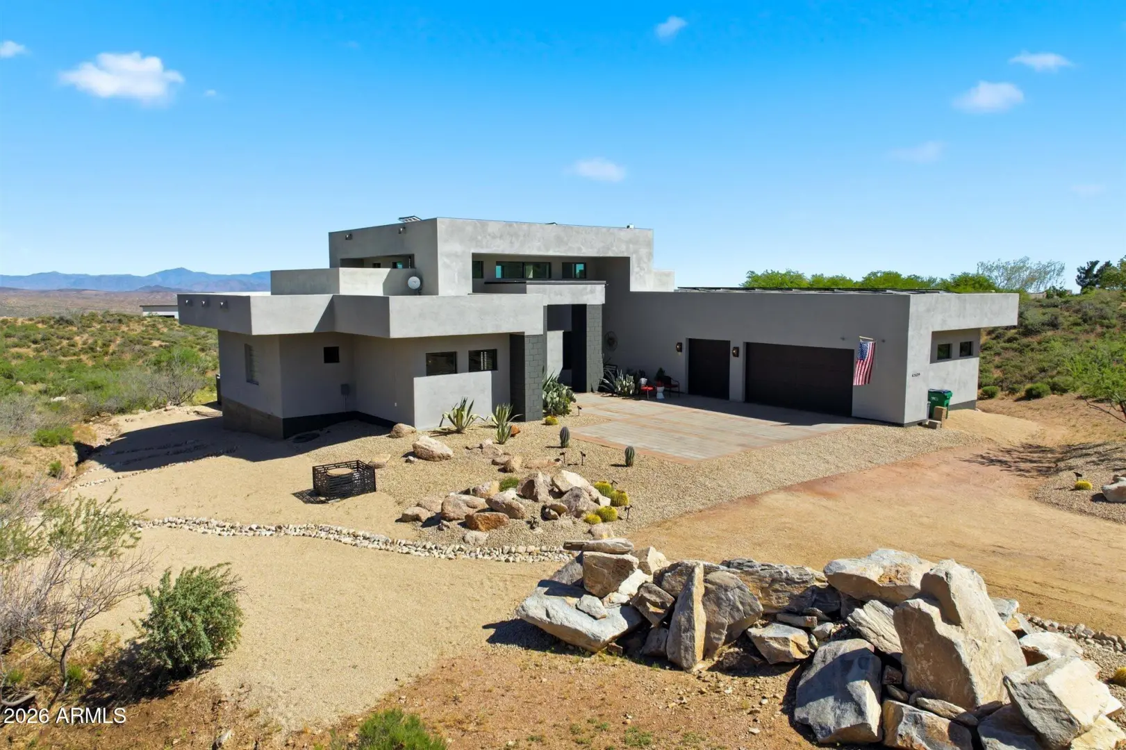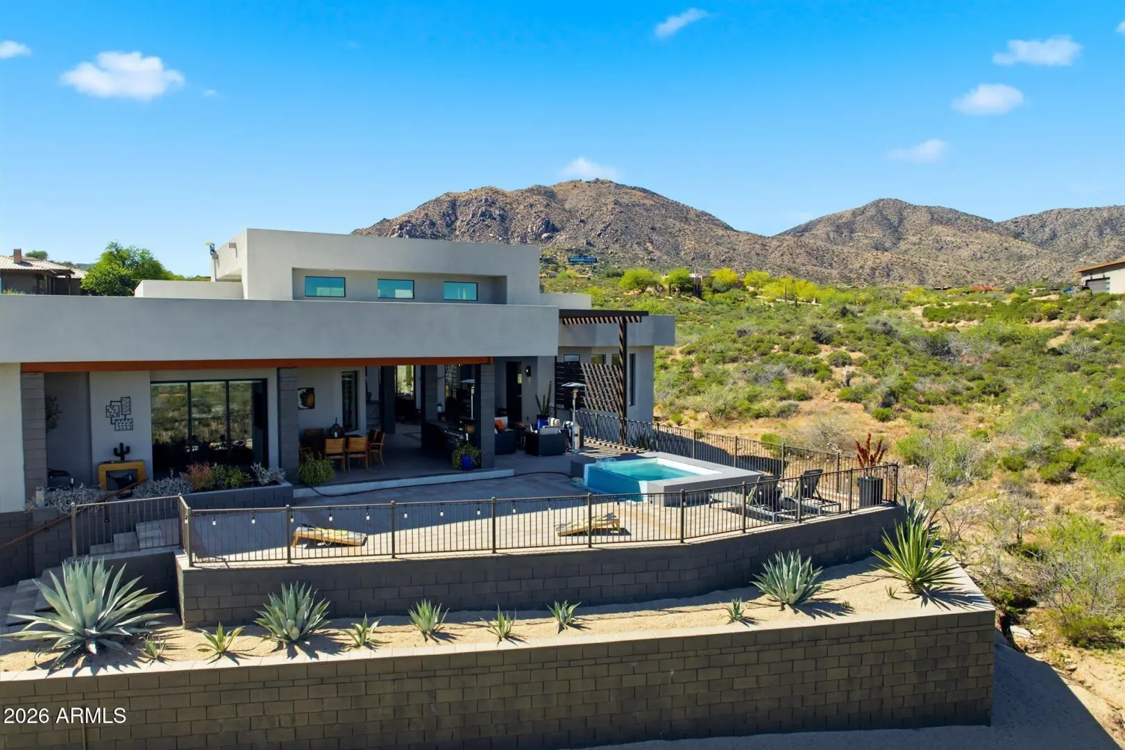 WELCOME HOME! ~Modern Scandinavian Luxury in Tonto Hills~ Experience elevated desert living in this exceptional modern Scandinavian-style residence, ideally positioned on a private 1.75-acre hillside lot at 3,455 ft in Tonto Hills. Surrounded by panoramic 360° views of Four Peaks, Weaver's Needle, and the Tonto National Forest, this custom home blends timeless Nordic design with Arizona's natural beauty. Designed for both serenity and entertaining, it offers over 2,400 sq. ft. of indoor-outdoor living including expansive patios, a spa, and elegant alfresco dining areas. The open-concept living space features soaring 20-ft ceilings, a sleek LED fireplace, and a chef's kitchen with waterfall granite countertops and premium KitchenAid appliances.