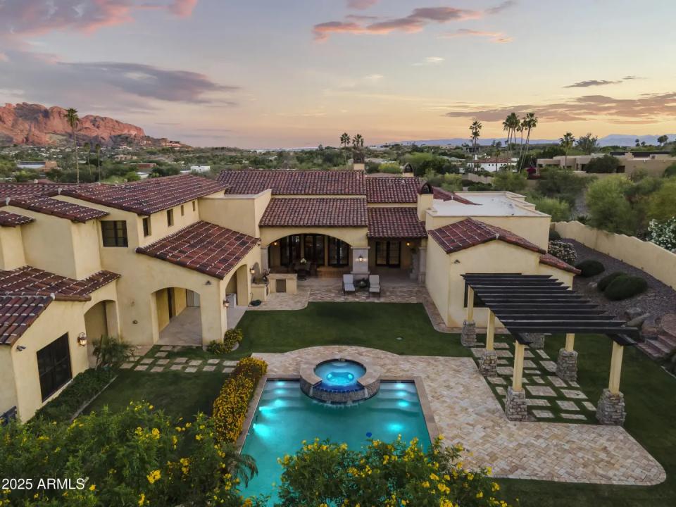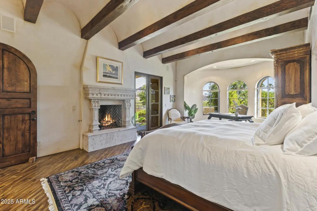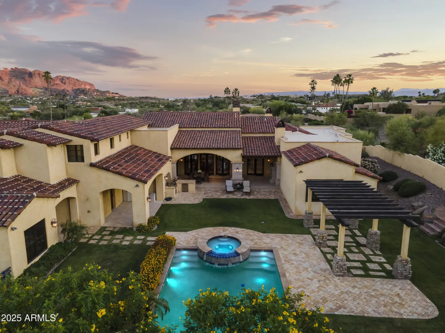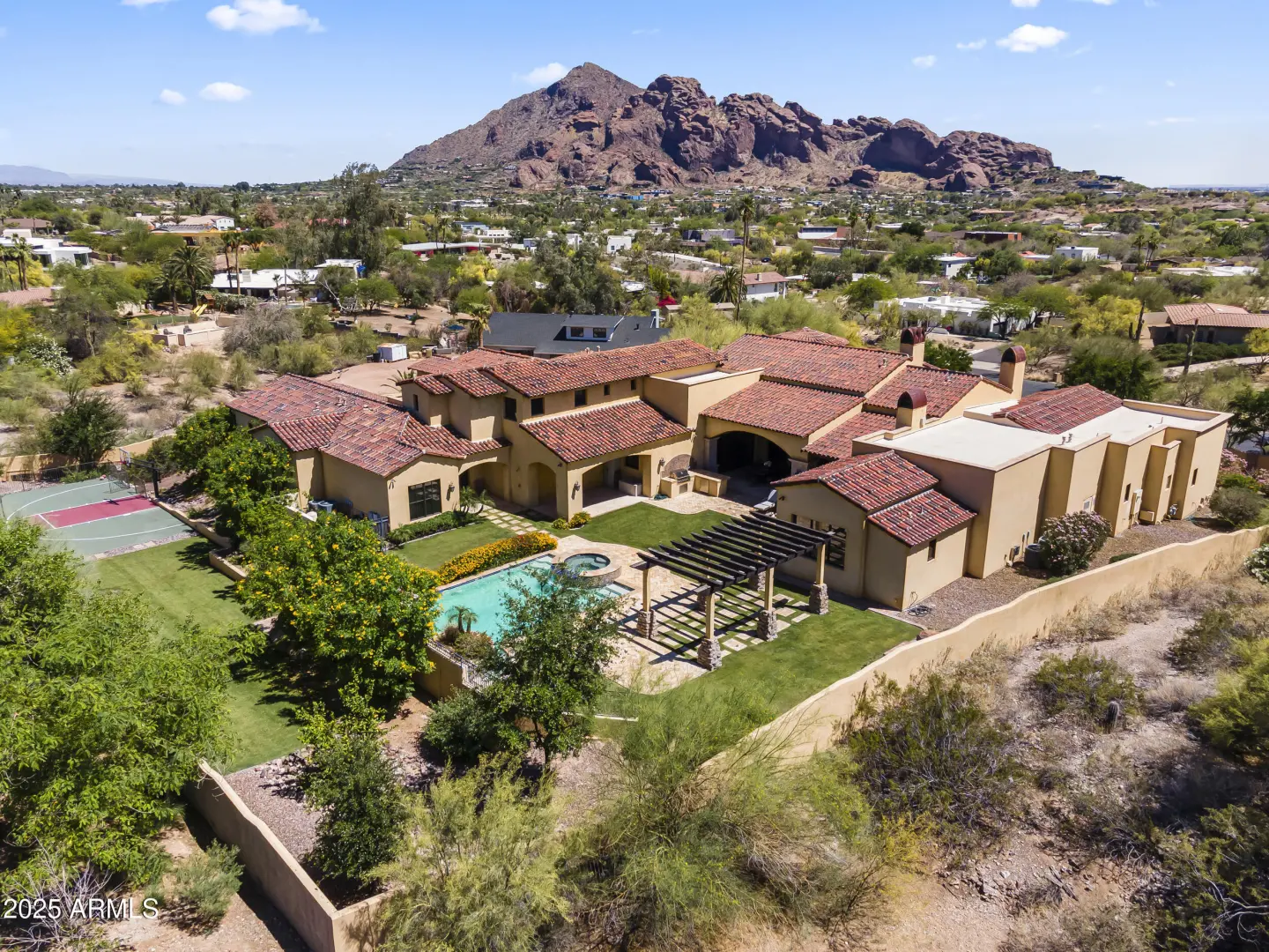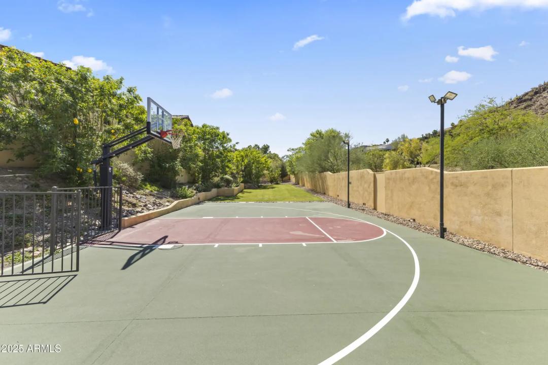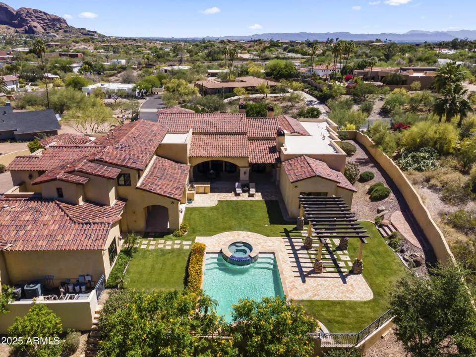 This exquisite hillside home built by renowned luxury builder Bedbrock Developer is perfectly positioned to capture stunning views of Camelback Mountain. Surrounded by a privacy wall, it showcases Mediterranean design such as Venetian plaster, terracotta roof tiles, arched entryways, Wrought iron accents & remote entry gate. Home features soaring ceilings with exposed wood beams and rich natural stone. The gourmet kitchen opens to a spacious family room with wet bar, wine cellar, primary suite with large walk-in closet, media room, formal dining room & living room w/French doors opening to resort style backyard & separate guest suite. The outside is a true retreat complete with a sparkling pool and spa, a mini soccer field, basketball/sport court and multiple patios. Prime location!