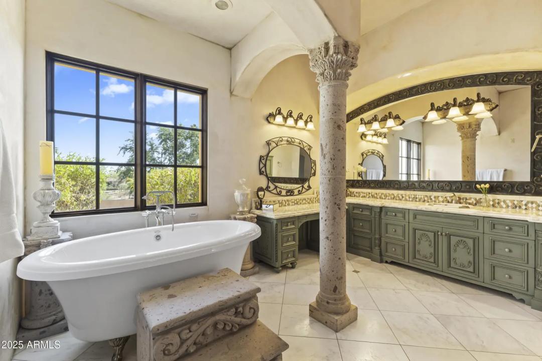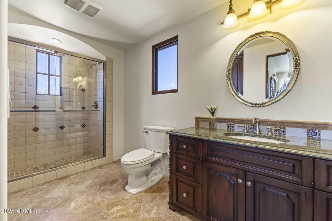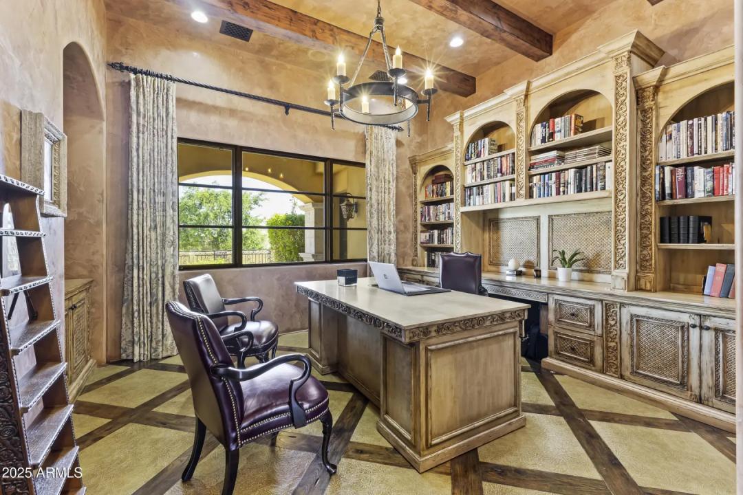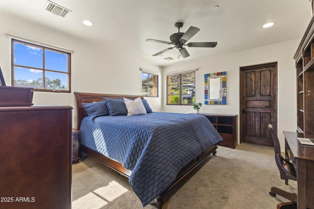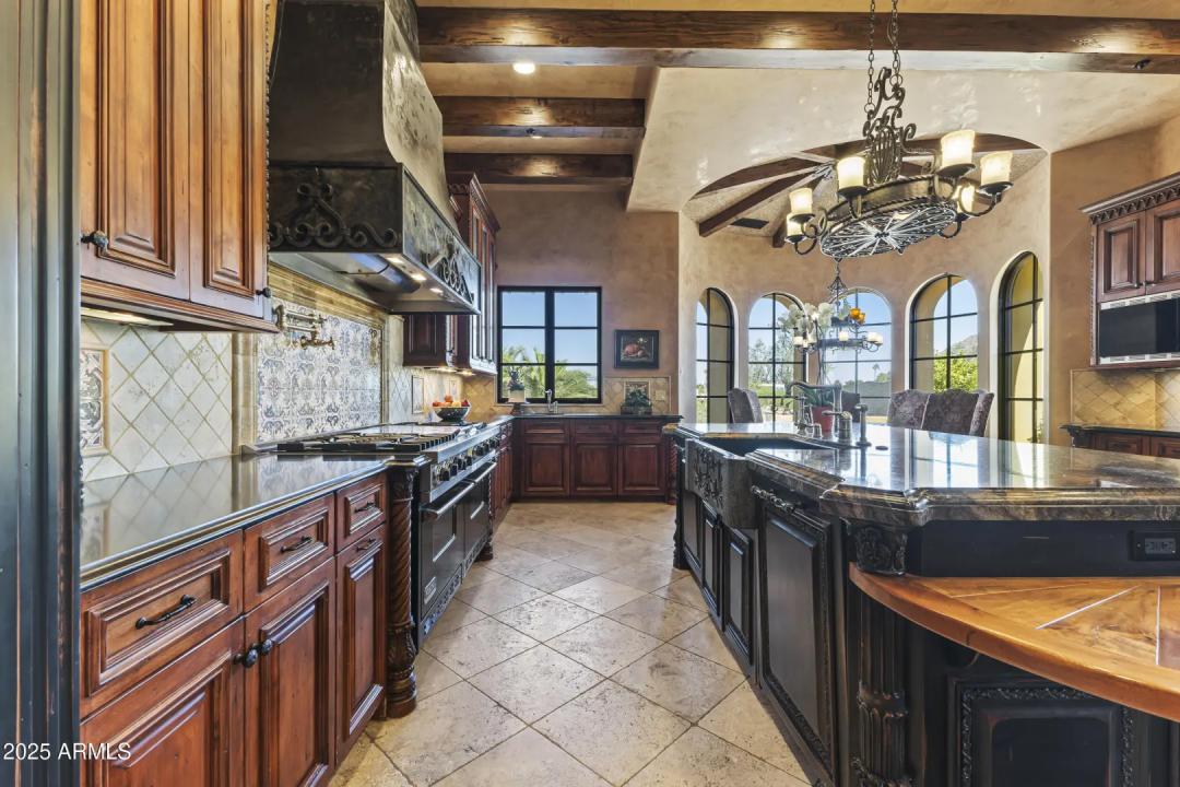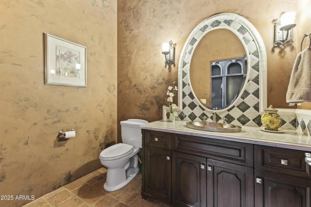 This exquisite hillside home built by renowned luxury builder Bedbrock Developer is perfectly positioned to capture stunning views of Camelback Mountain. Surrounded by a privacy wall, it showcases Mediterranean design such as Venetian plaster, terracotta roof tiles, arched entryways, Wrought iron accents & remote entry gate. Home features soaring ceilings with exposed wood beams and rich natural stone. The gourmet kitchen opens to a spacious family room with wet bar, wine cellar, primary suite with large walk-in closet, media room, formal dining room & living room w/French doors opening to resort style backyard & separate guest suite. The outside is a true retreat complete with a sparkling pool and spa, a mini soccer field, basketball/sport court and multiple patios. Prime location!