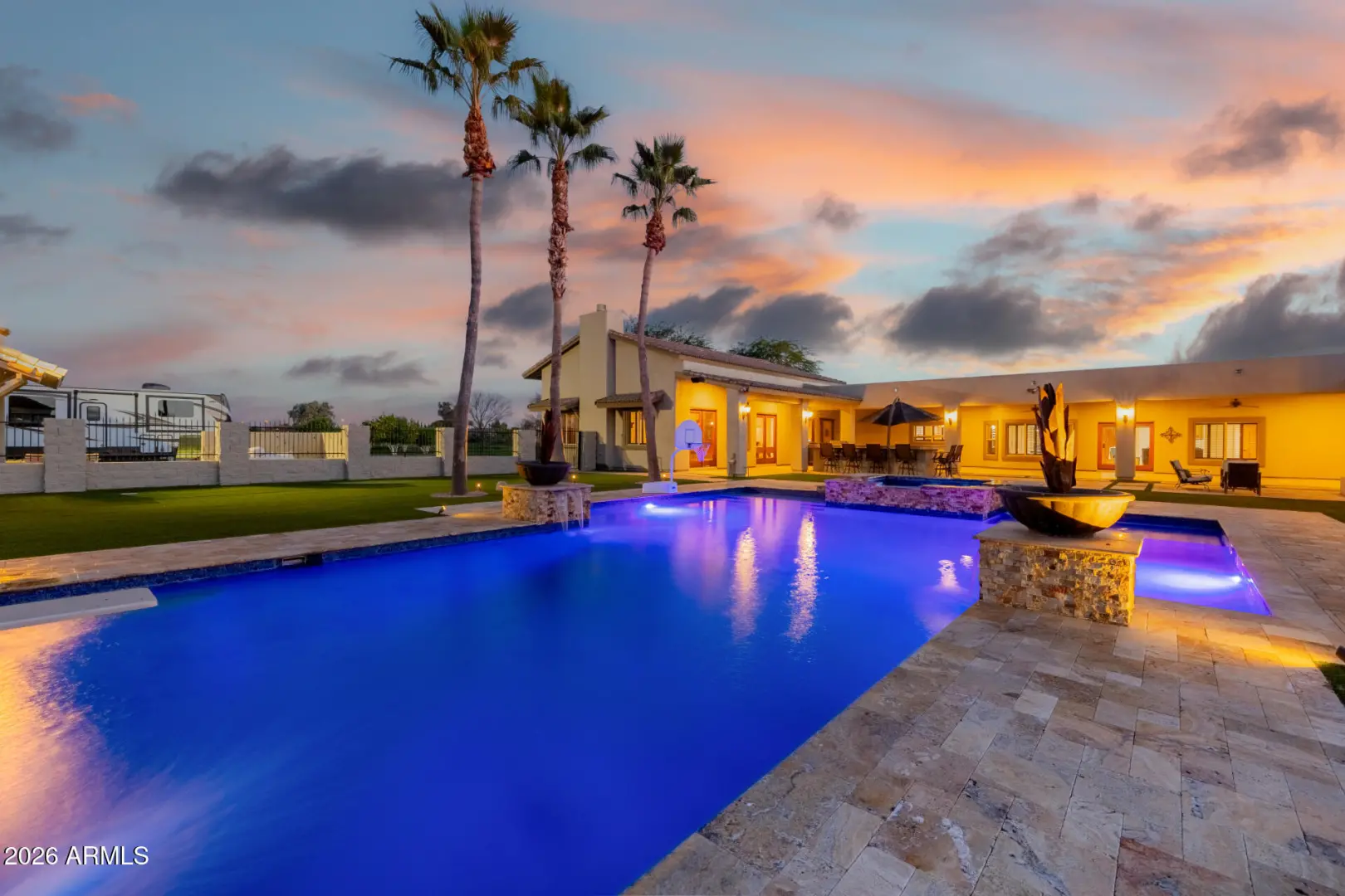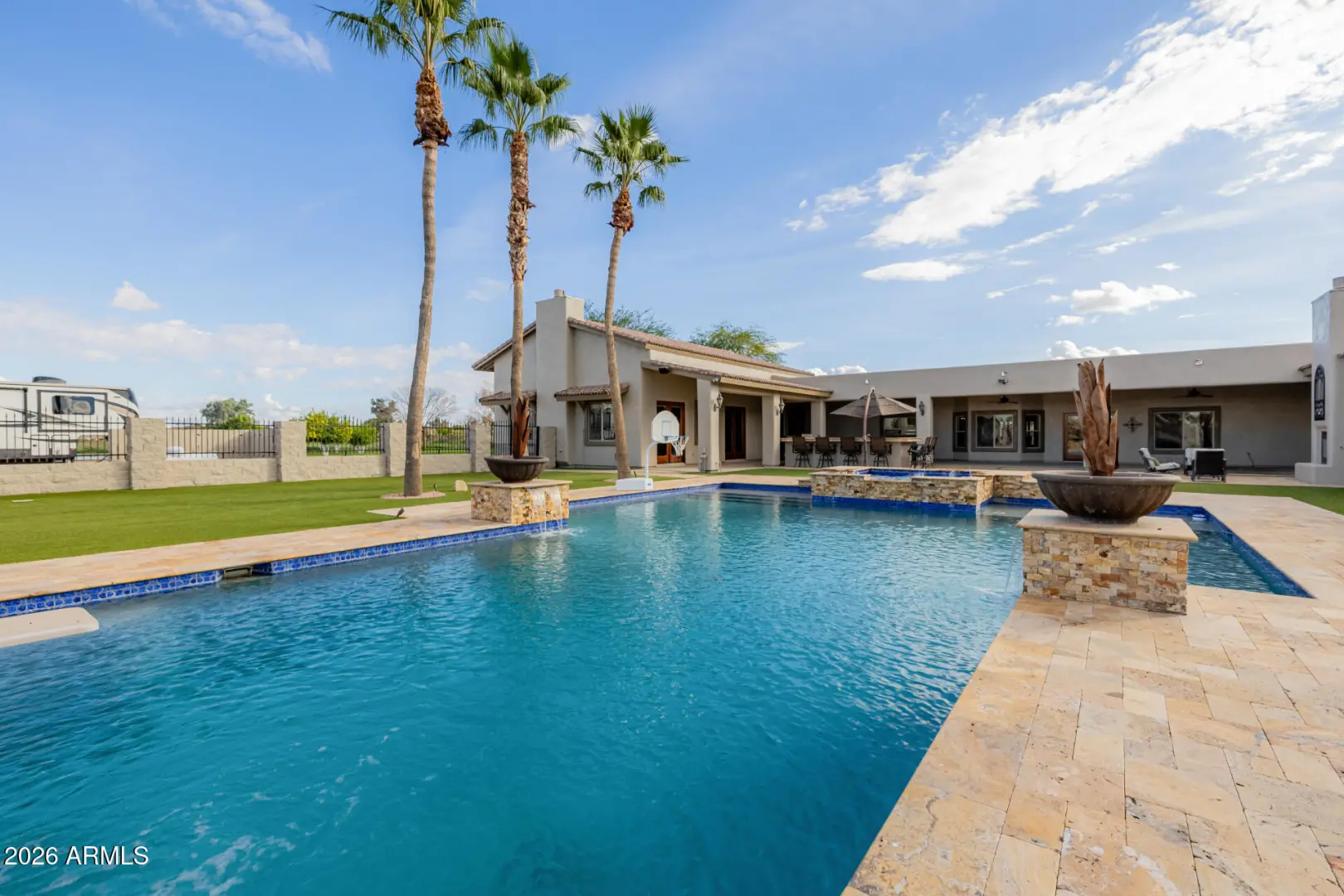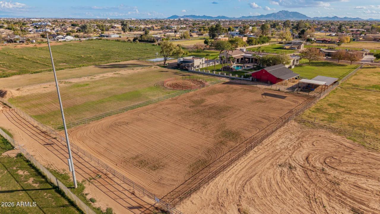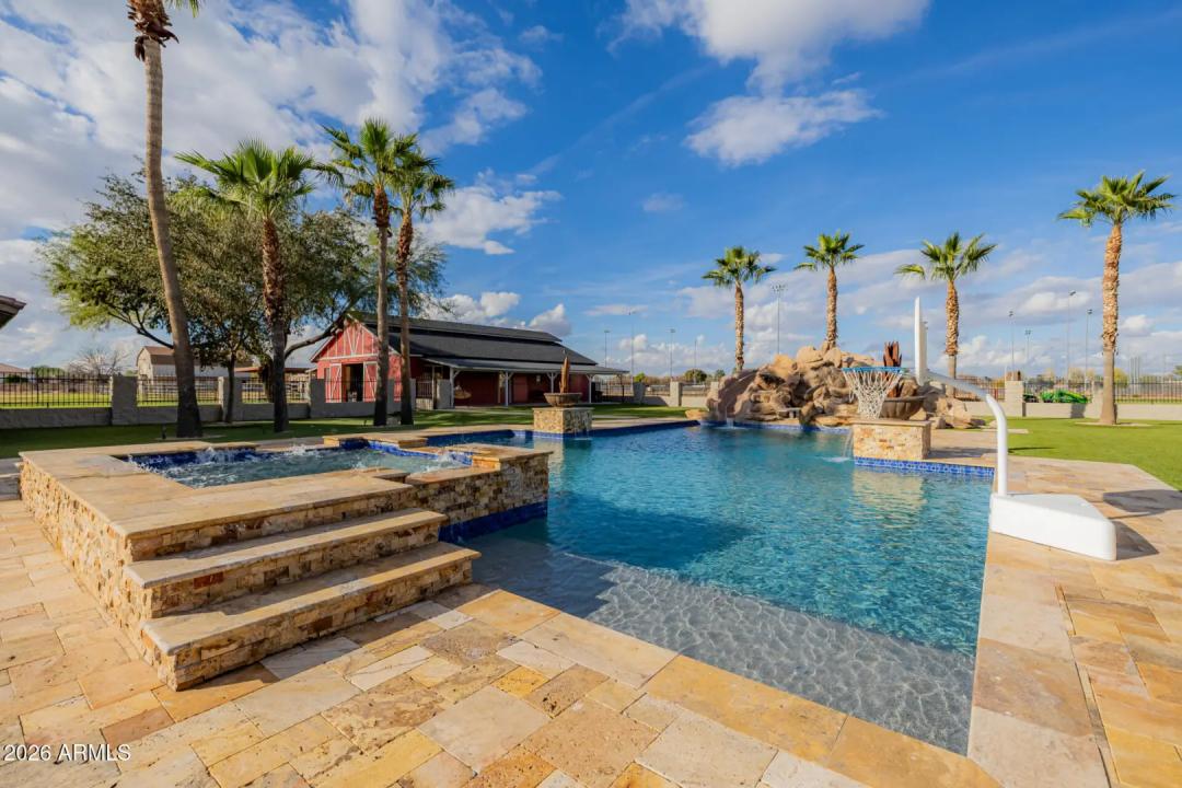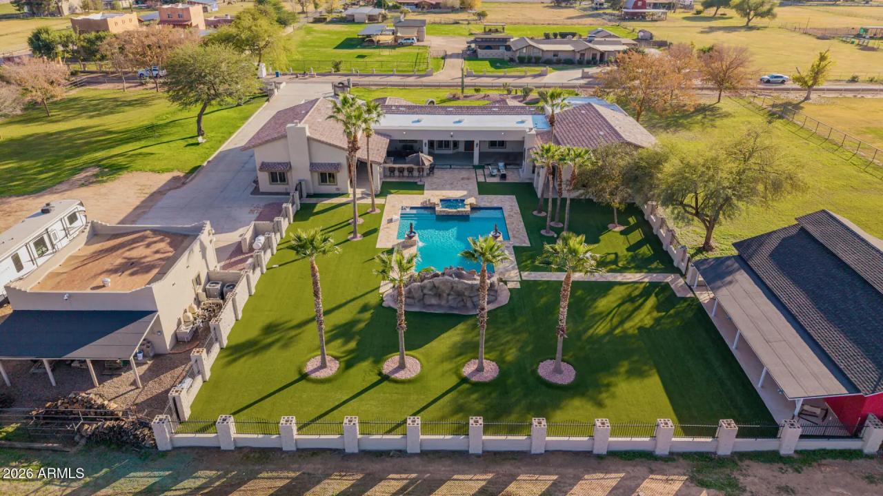 If you've been dreaming of a place where every day feels like a getaway, this exceptional estate delivers. Situated in one of Gilbert's most sought-after areas, this quiet and private property spans nearly 5 irrigated acres, an offering that rarely comes to market. The seller invested extraordinary care into the home, sparing no expense and thoughtfully upgrading every detail throughout. The custom single-level main residence of almost 6,600 sqft. offers 5 beds, 4 beautifully tiled natural stone baths, 2 laundry rooms, plus spacious bonus room that could easily function as a 6th bedroom with exterior access. Guest house! One of the home's most impressive features is the expansive 1,250 sqft. game room, showcasing vaulted wood-beam ceilings, a stone fireplace, a built-in dining table and a