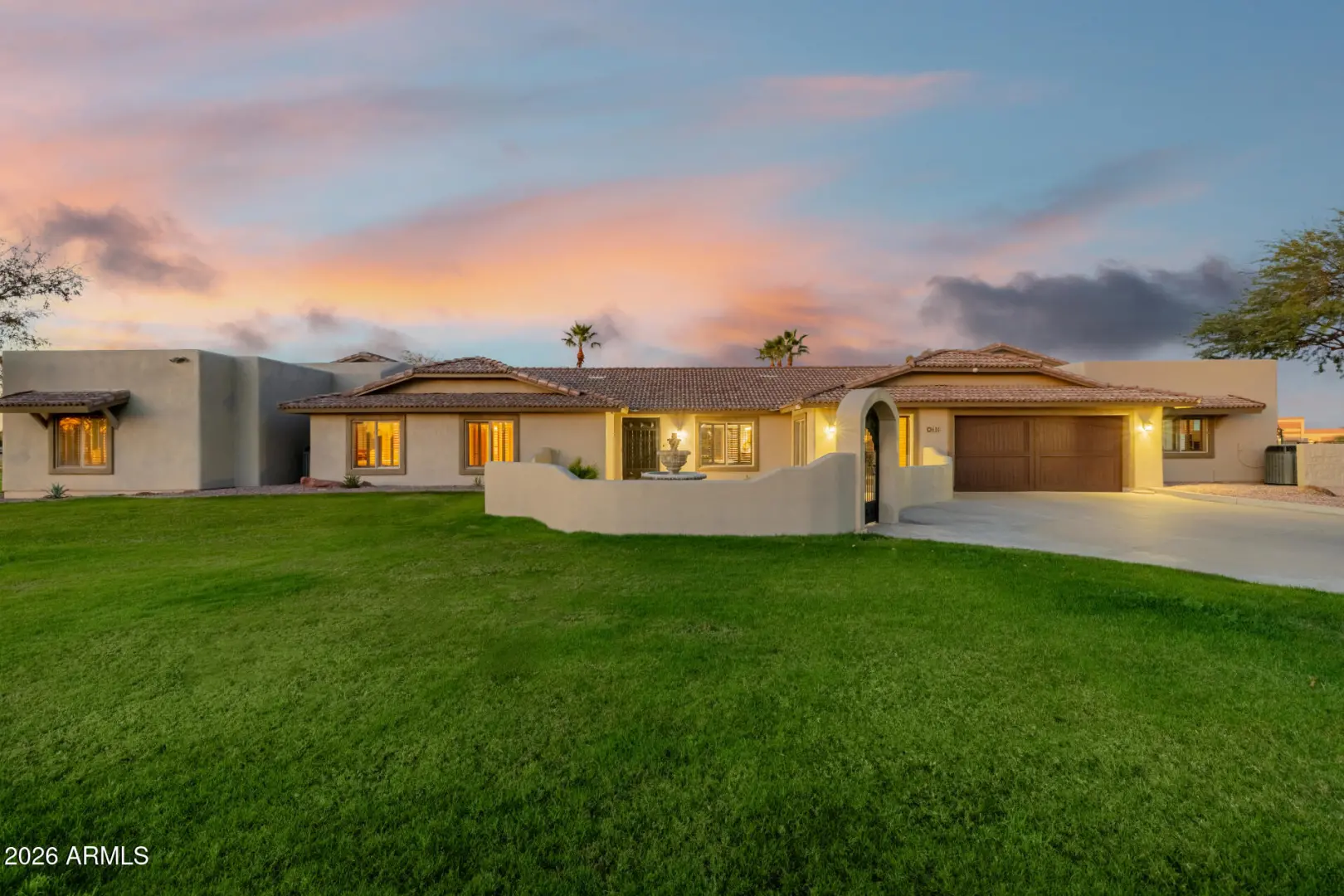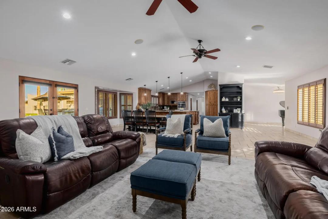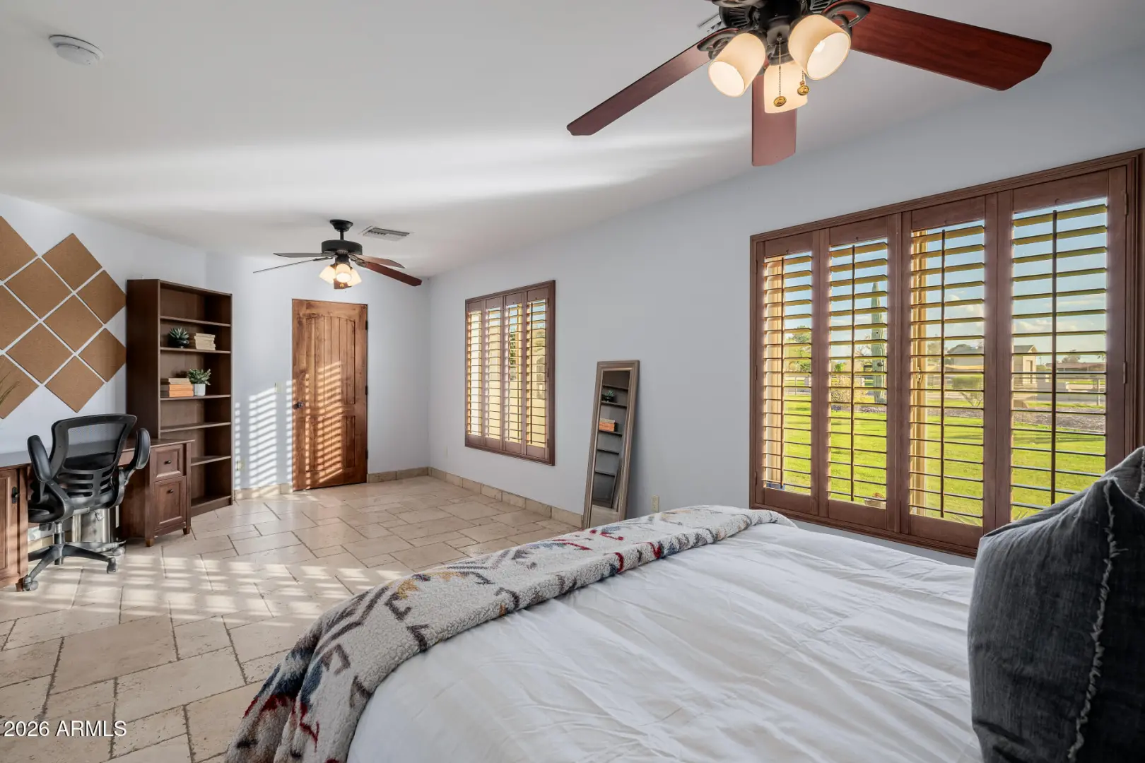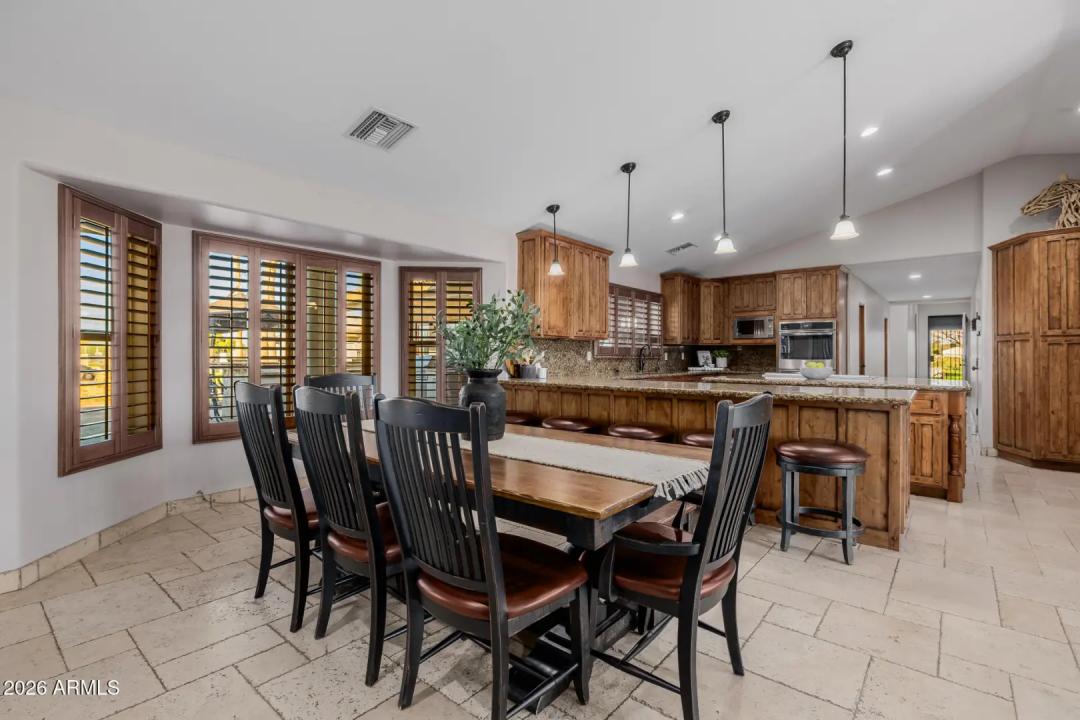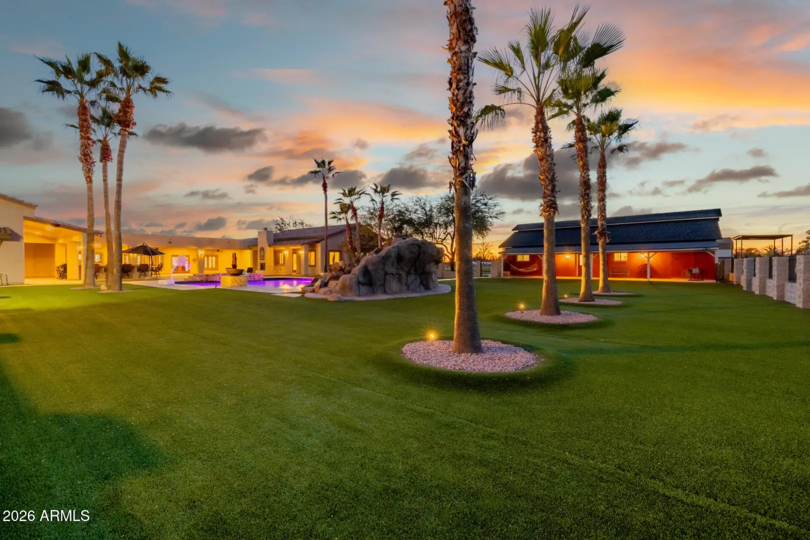 If you've been dreaming of a place where every day feels like a getaway, this exceptional estate delivers. Situated in one of Gilbert's most sought-after areas, this quiet and private property spans nearly 5 irrigated acres, an offering that rarely comes to market. The seller invested extraordinary care into the home, sparing no expense and thoughtfully upgrading every detail throughout. The custom single-level main residence of almost 6,600 sqft. offers 5 beds, 4 beautifully tiled natural stone baths, 2 laundry rooms, plus spacious bonus room that could easily function as a 6th bedroom with exterior access. Guest house! One of the home's most impressive features is the expansive 1,250 sqft. game room, showcasing vaulted wood-beam ceilings, a stone fireplace, a built-in dining table and a