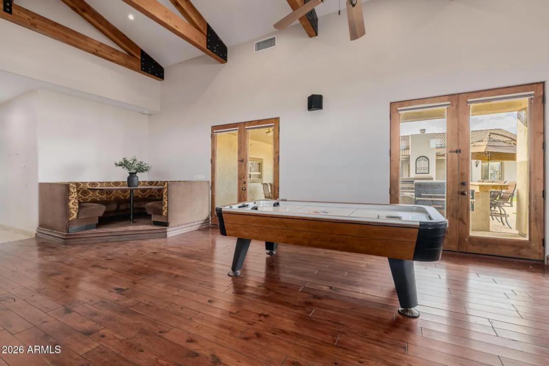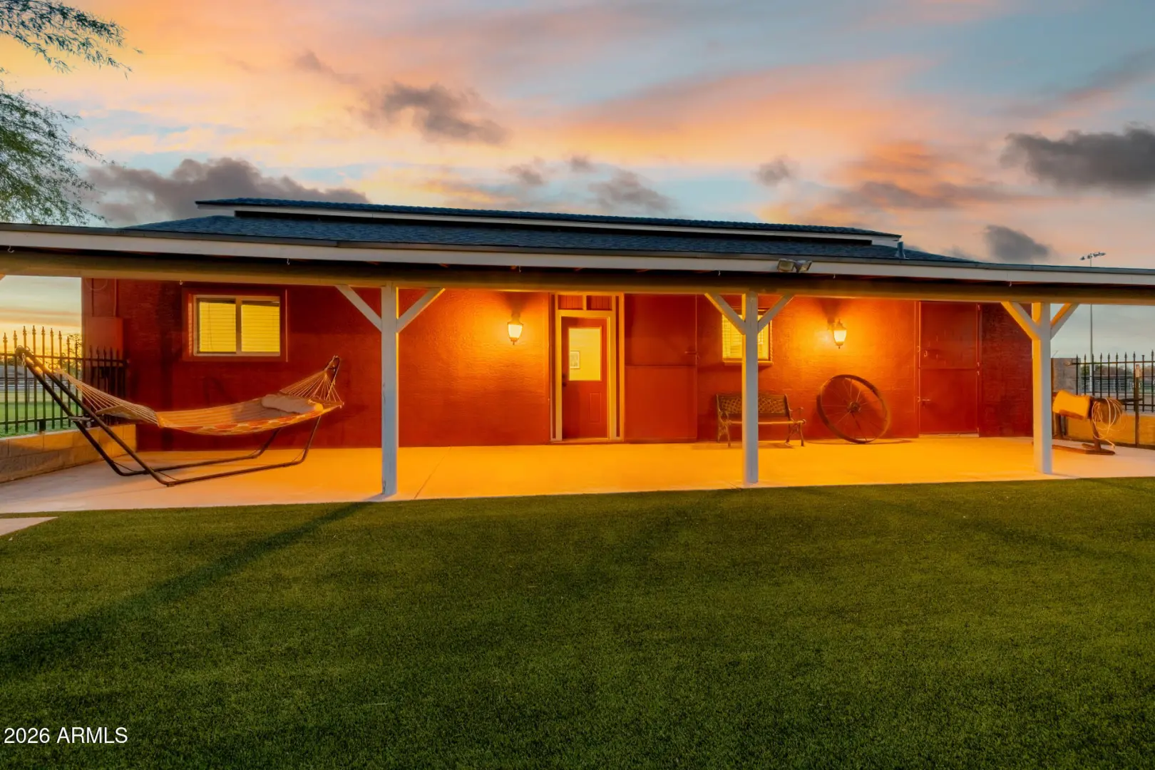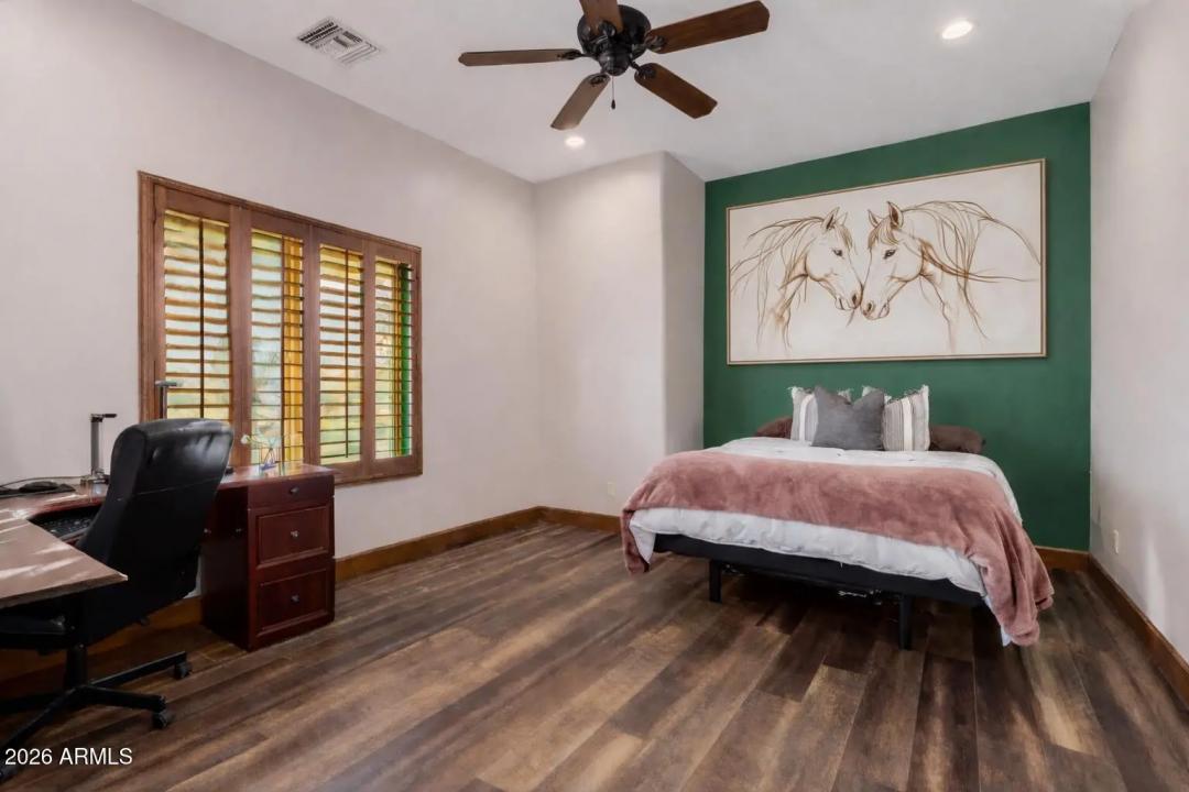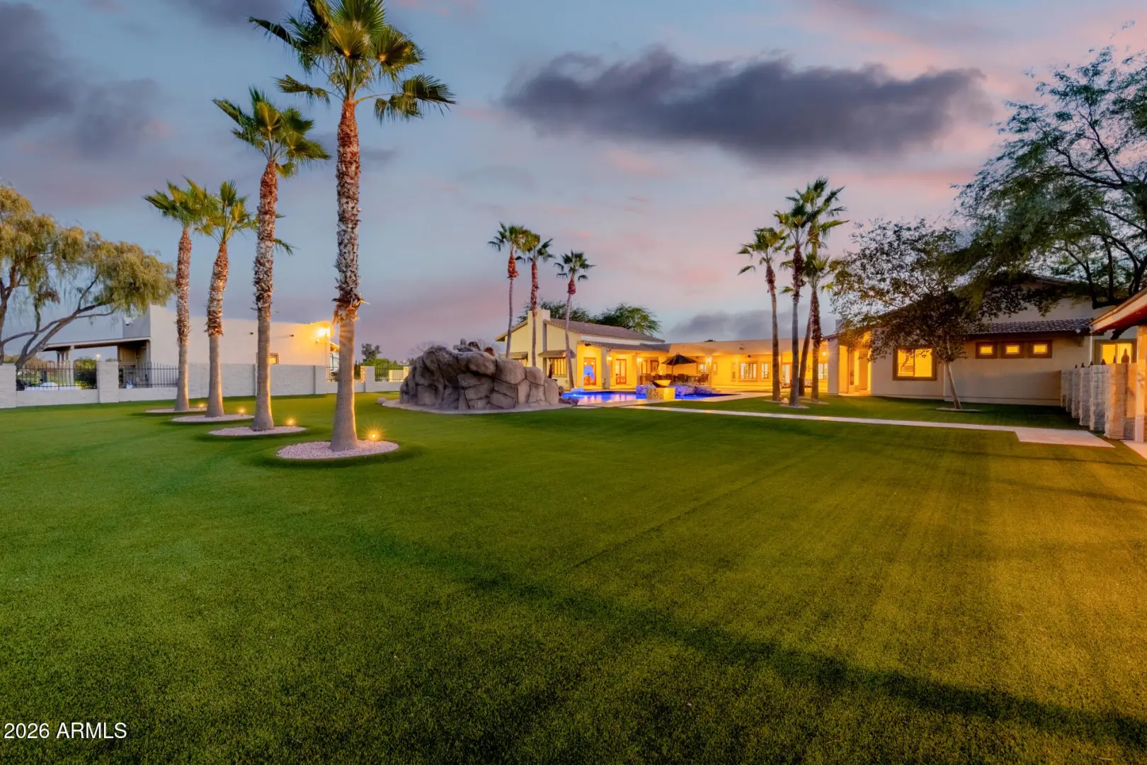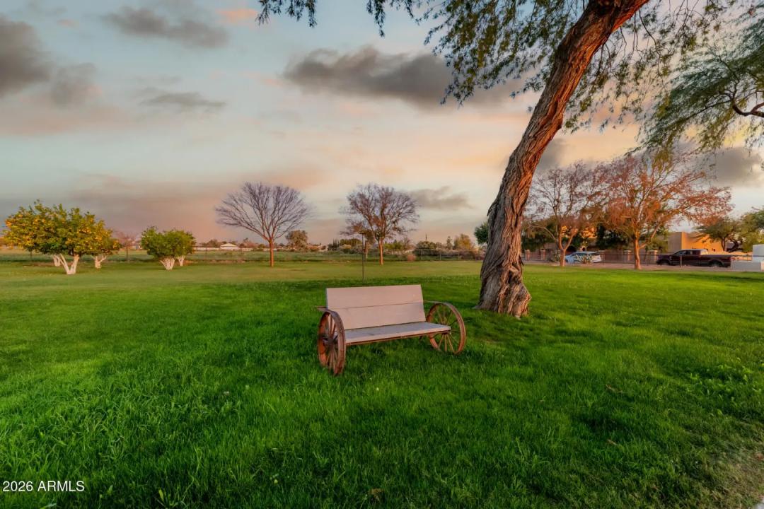 If you've been dreaming of a place where every day feels like a getaway, this exceptional estate delivers. Situated in one of Gilbert's most sought-after areas, this quiet and private property spans nearly 5 irrigated acres, an offering that rarely comes to market. The seller invested extraordinary care into the home, sparing no expense and thoughtfully upgrading every detail throughout. The custom single-level main residence of almost 6,600 sqft. offers 5 beds, 4 beautifully tiled natural stone baths, 2 laundry rooms, plus spacious bonus room that could easily function as a 6th bedroom with exterior access. Guest house! One of the home's most impressive features is the expansive 1,250 sqft. game room, showcasing vaulted wood-beam ceilings, a stone fireplace, a built-in dining table and a