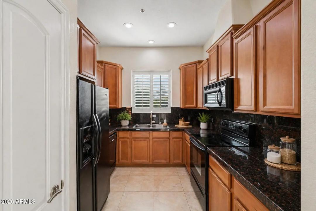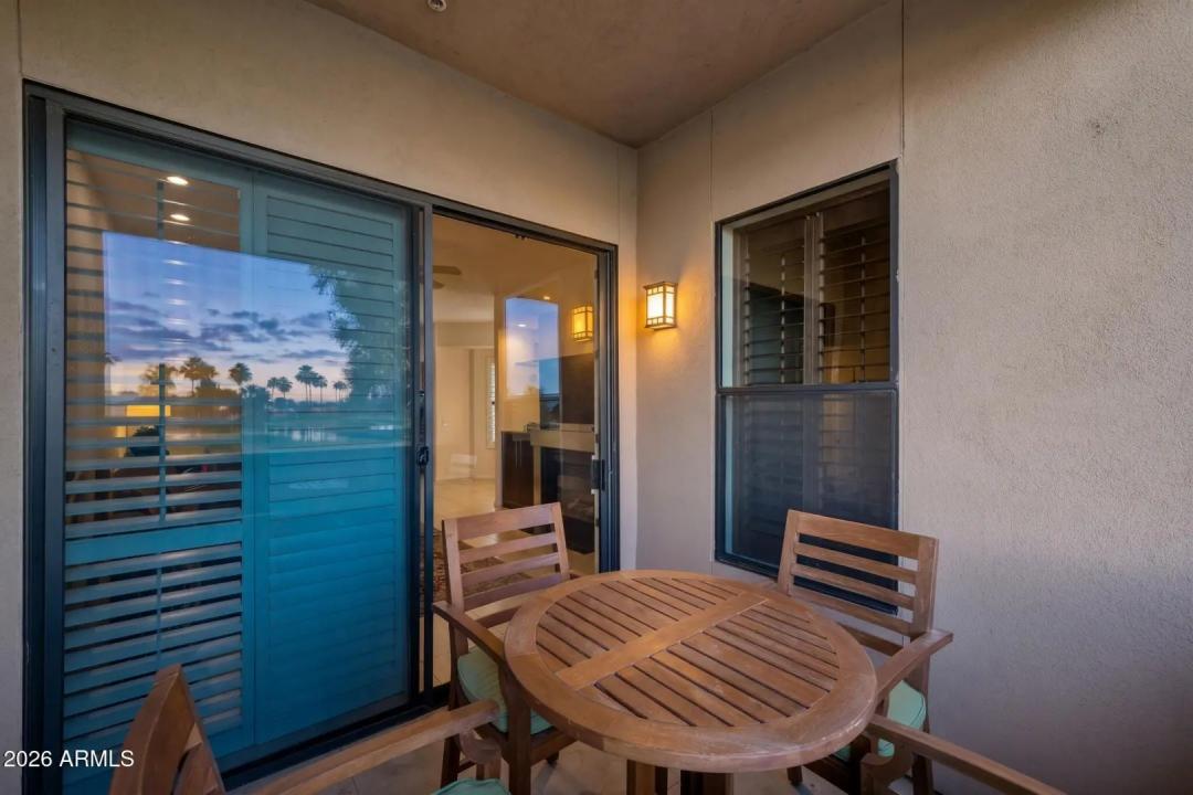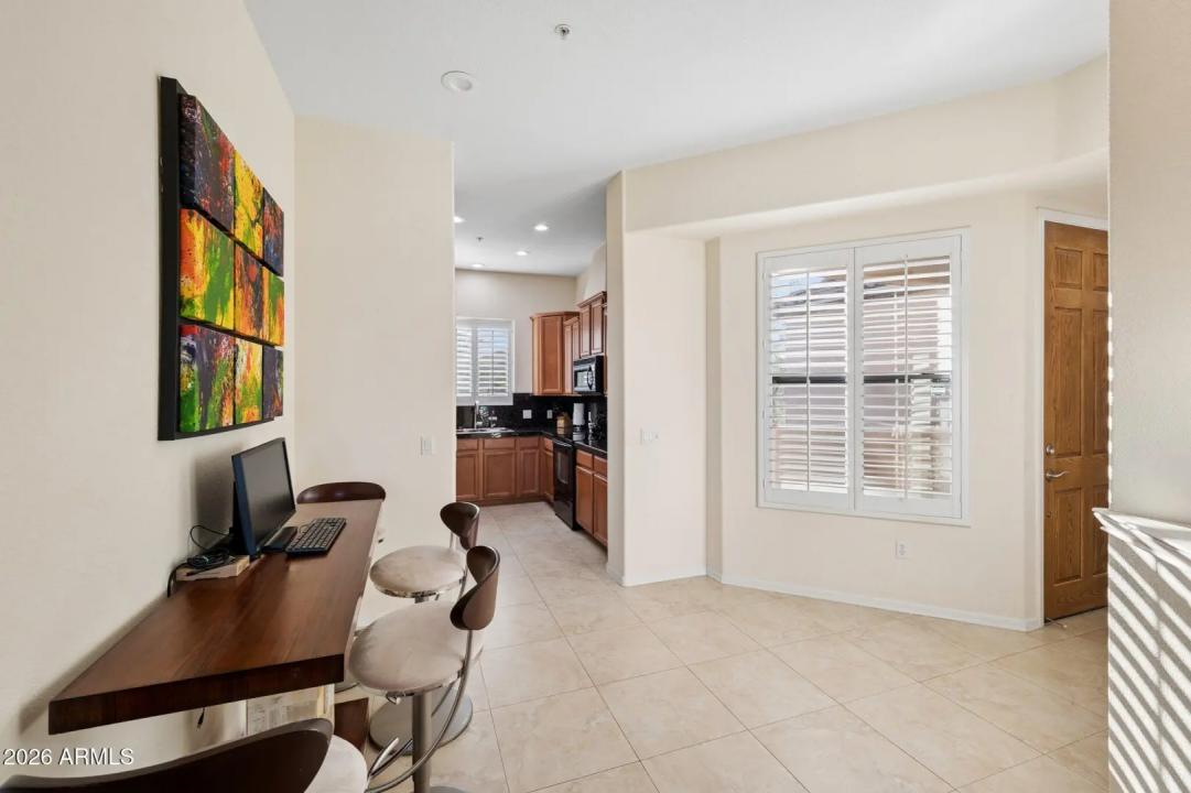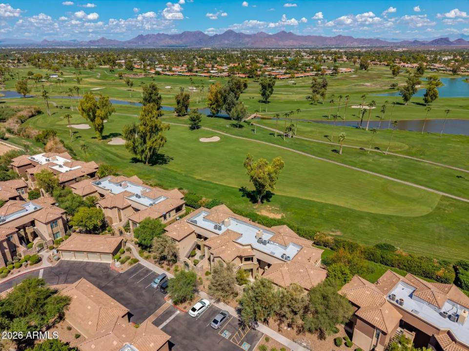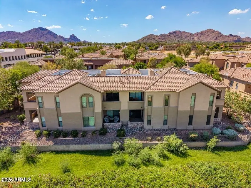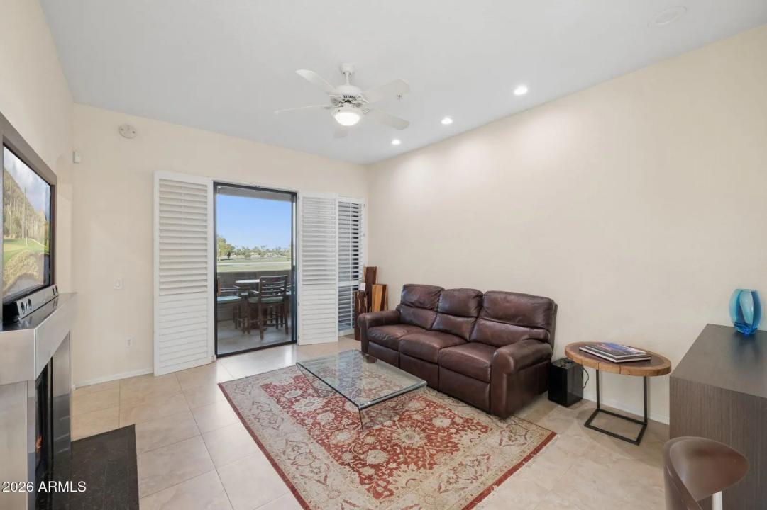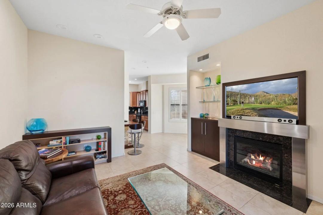 Do not miss this rarely available golf course unit with a private garage in the resort-style gated community of Traviata offering million dollar golf course and mountain views in the heart of Paradise Valley and perfectly positioned within walking distance to world-class dining, the new Ritz-Carlton, Scottsdale Fashion Square, the Scottsdale Train Park, luxury hotels and more. This open concept home features a spacious kitchen with upgraded cabinets and countertops, porcelain tile throughout main living areas, and a gas fireplace with rich granite surround. The light-filled primary suite boasts a generous walk-in closet and desk area, while recent upgrades include a new electric HVAC system (2023). Unwind with a glass of wine as the sun sets over the golf course from your private patio,