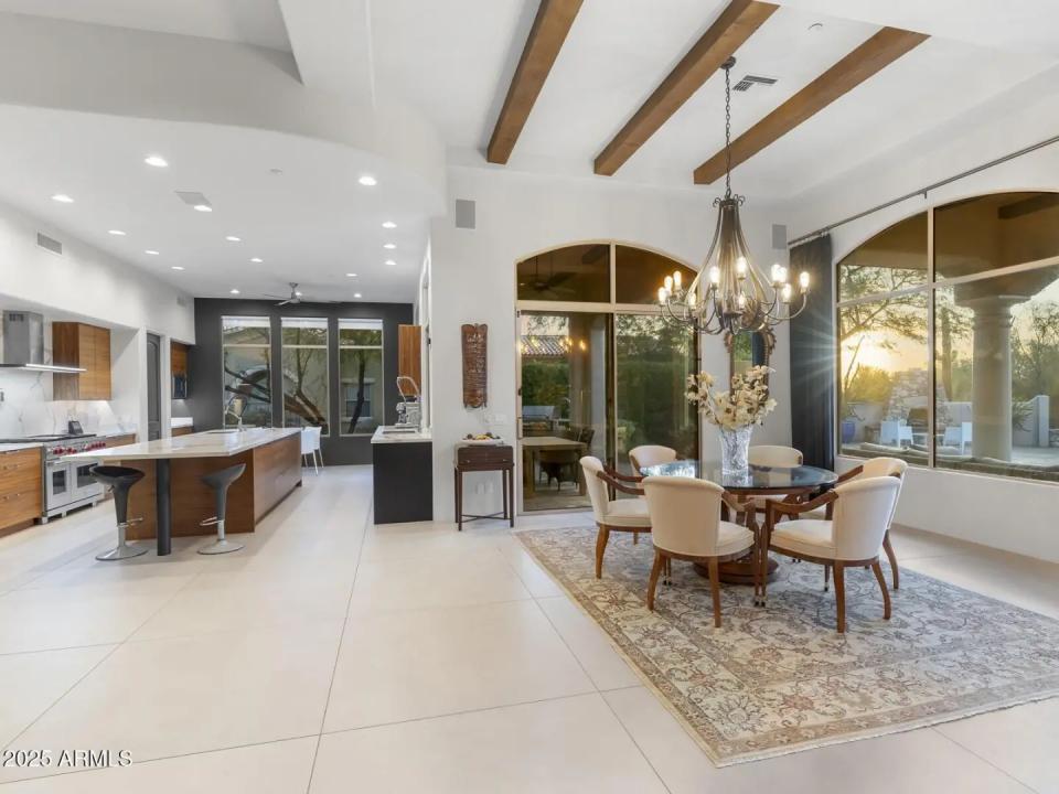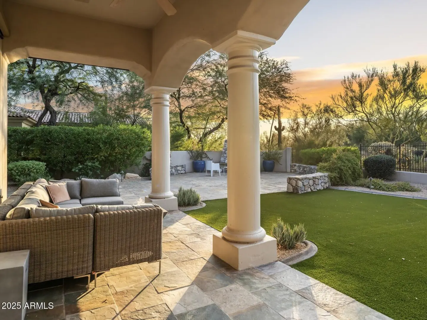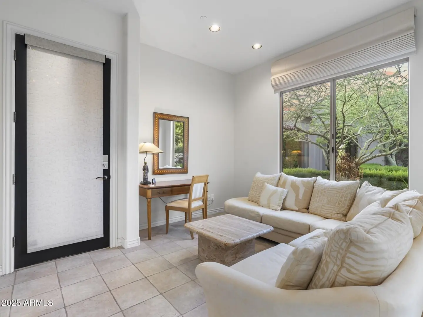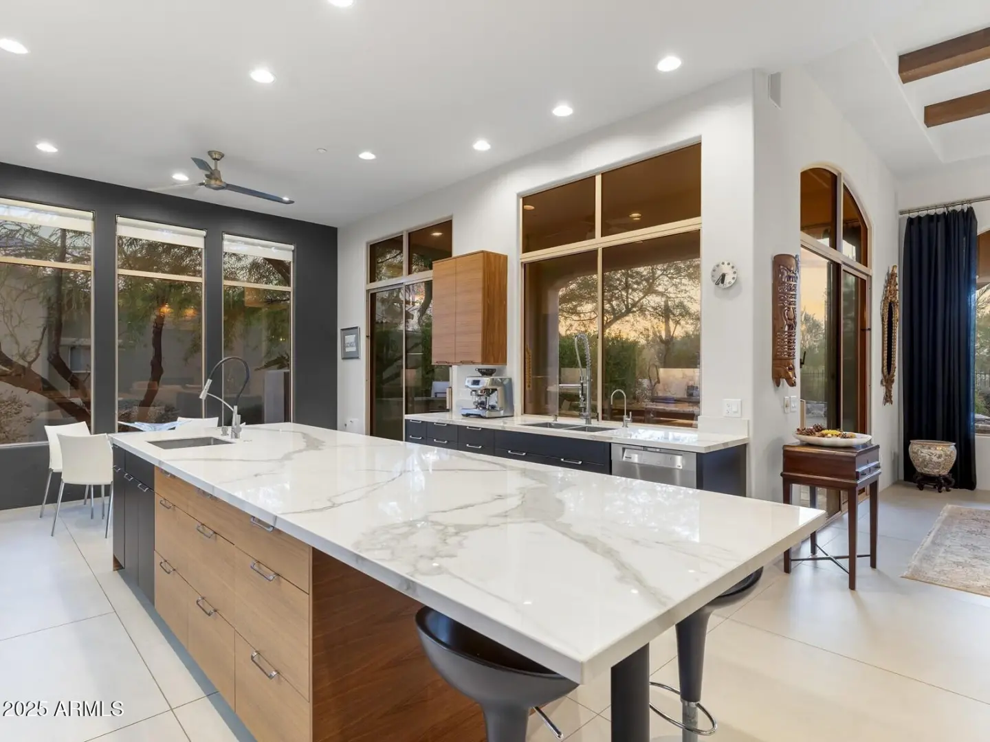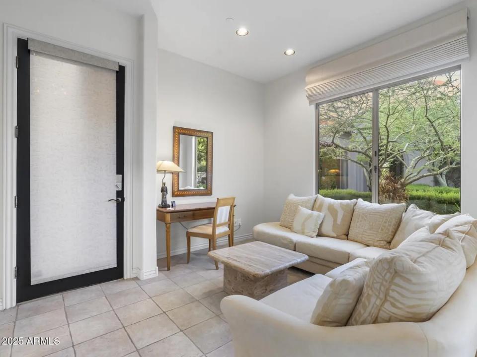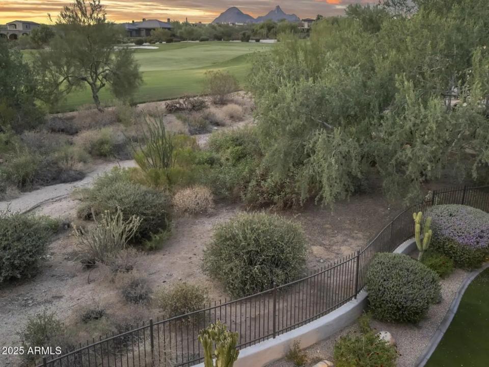 Updated Edmunds residence with detached casita, perfectly sited on a coveted golf-course lot in guard-gated DC Ranch Country Club. One of only 54 homes by the Club, it backs the 2nd fairway, sides to open space, and fronts a grassy park. A vaulted great room unites living, dining, and a chef's kitchen with walnut cabinetry, oversized island, walk-in pantry, and a 48″ Wolf range with 72″ Sub-Zero. High ceilings, 4×4 Italian porcelain, custom built-ins, and renewed baths set a crisp, modern tone. The split primary retreat offers a sitting area, fireplace, patio access, dual closets, and a spa bath with steam shower. Outdoor living unfolds front and back: a secluded courtyard with pool and water feature; a deep yard with turf, fireplace, waterfall, two covered patios, and built-in